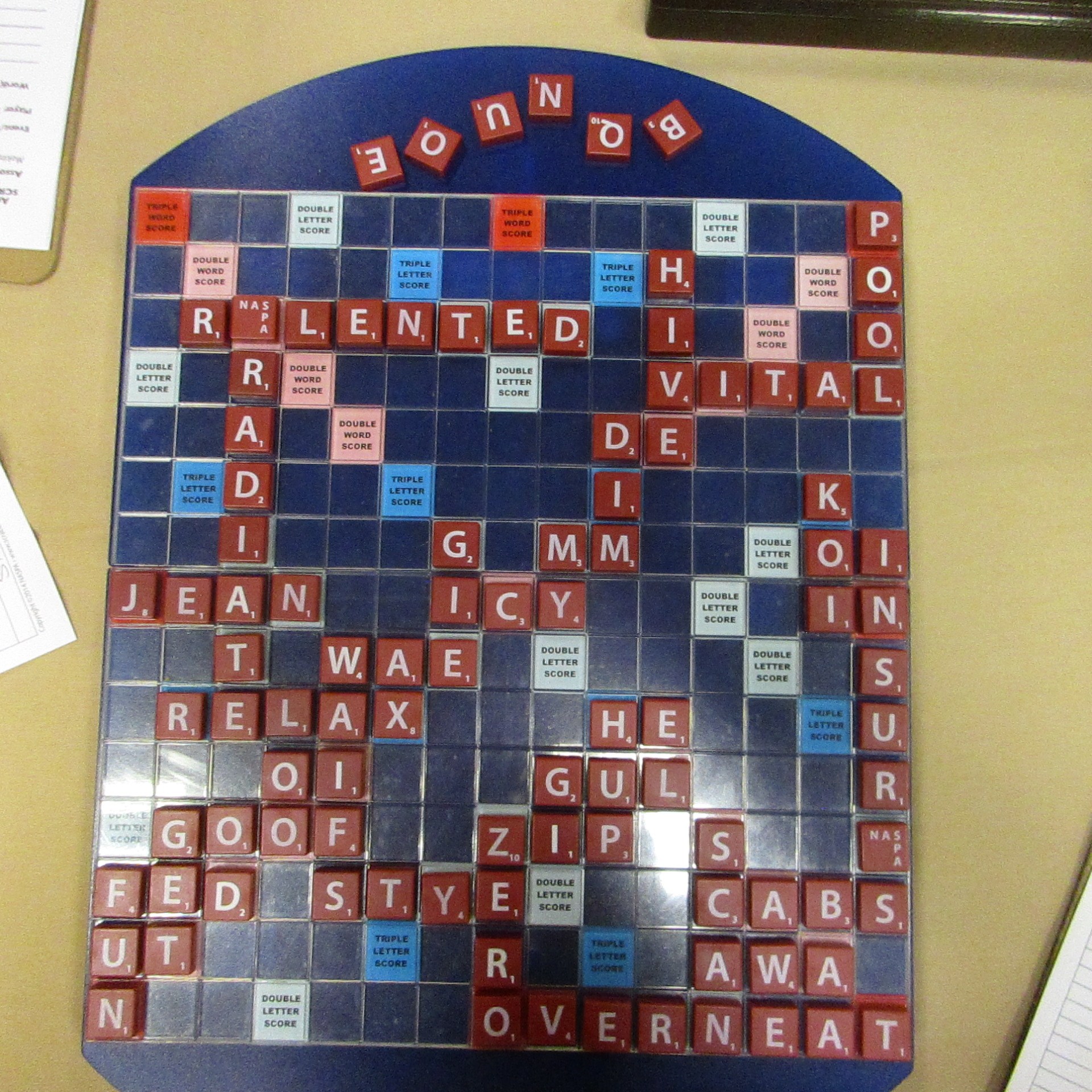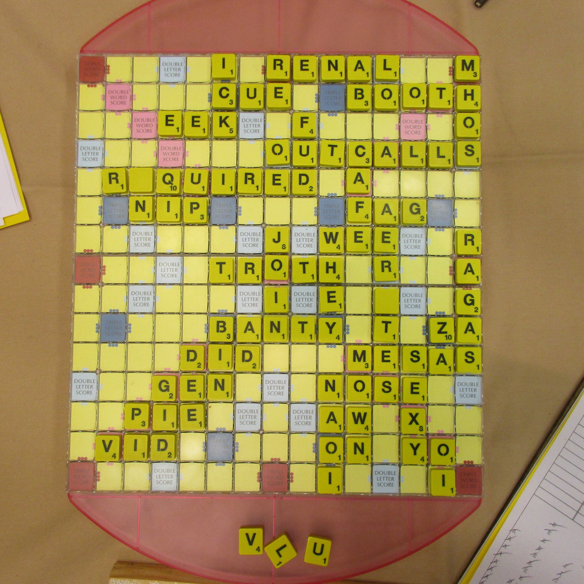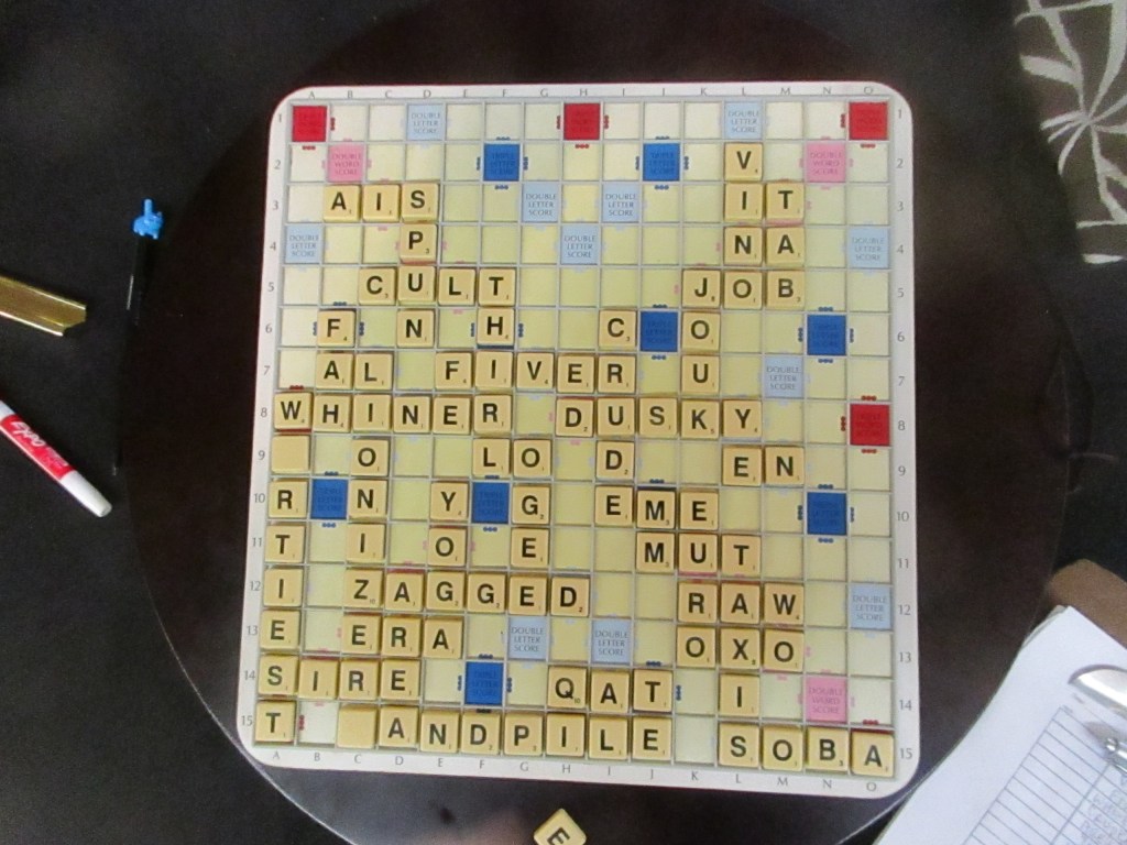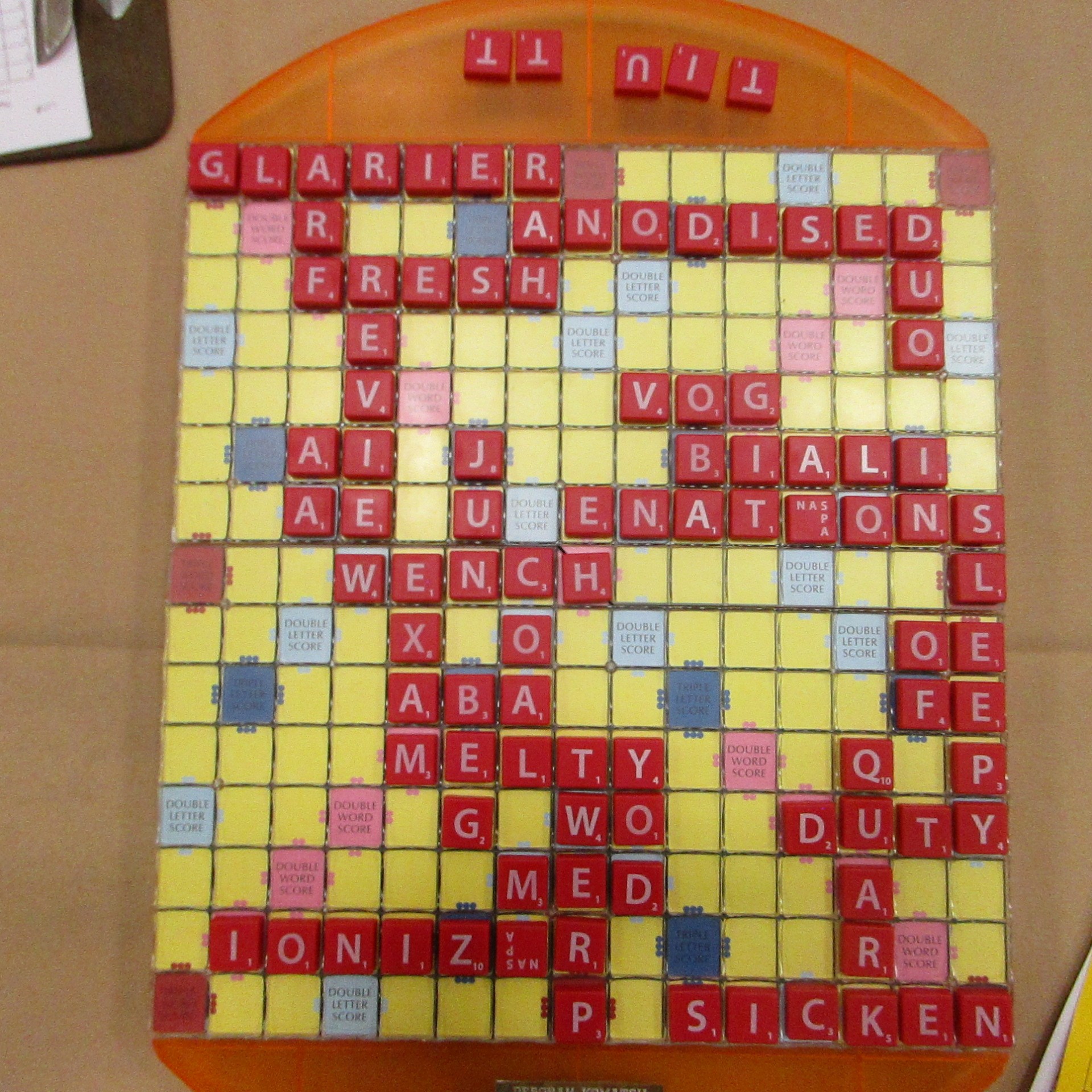 Game 15: I reconstructed this board from my scoresheet (just for YOU!), as I failed to take a pic of the final board at the tournament. Opp got down the only bingo PAREN(T)Ed 70 which had me scrambling to catch up. I guessed my outplay of S(O) which, if I played it, was 16 pts, not 15 as noted on scoresheet. Lost 10 pts because I went overtime on my clock, and LOST the game by 19.