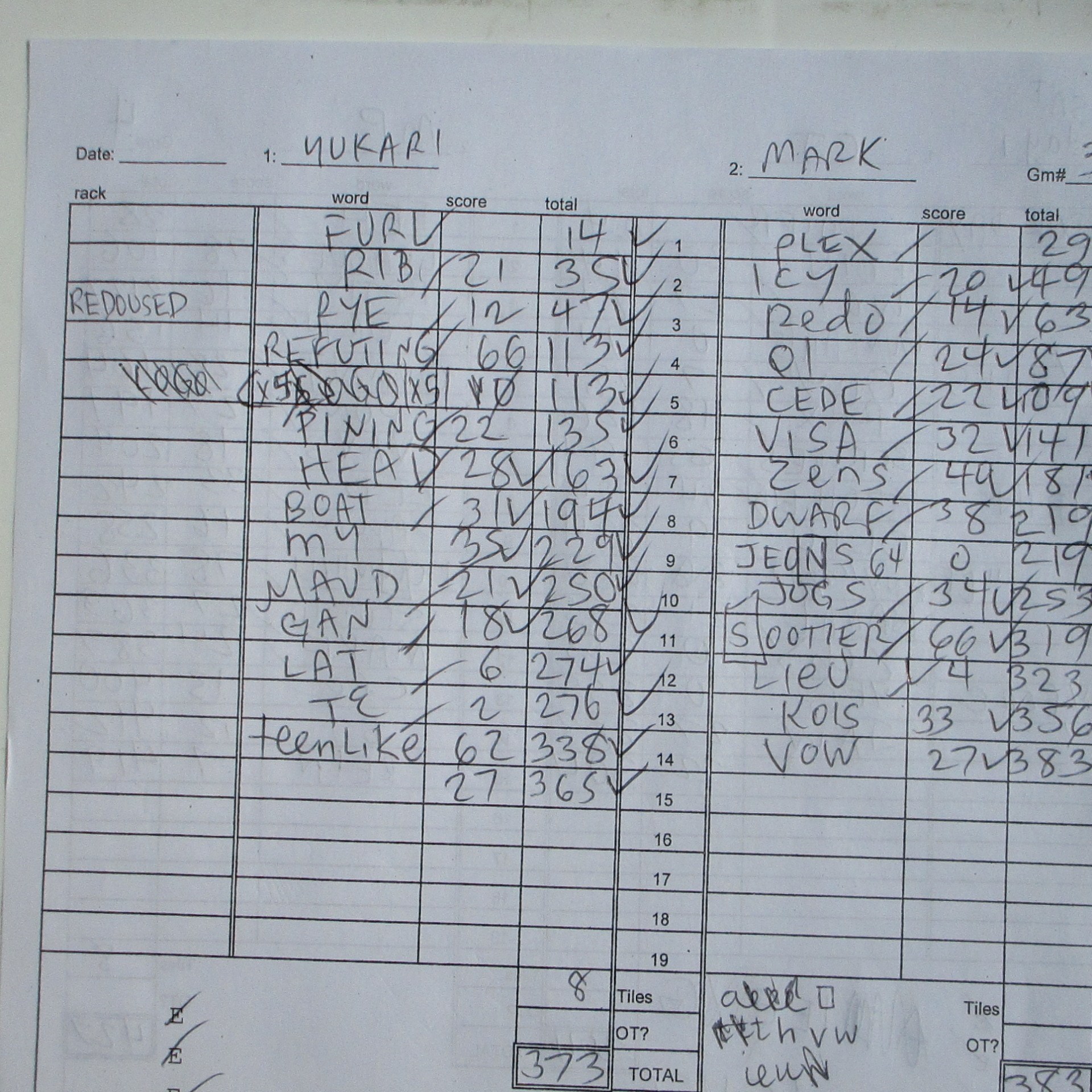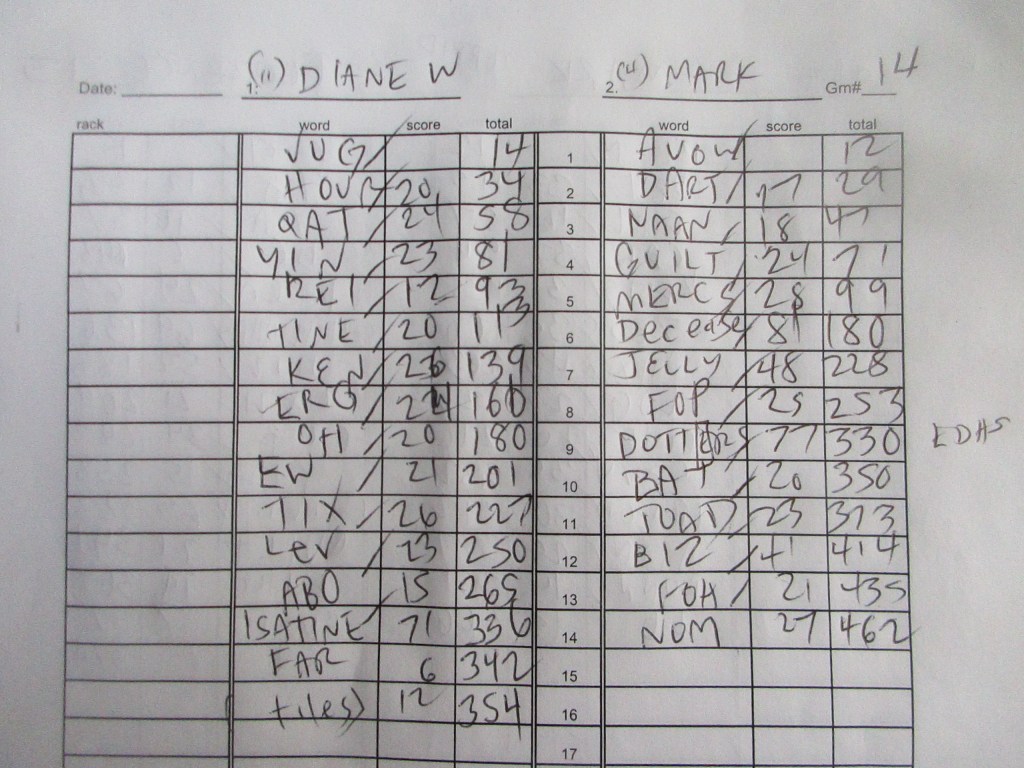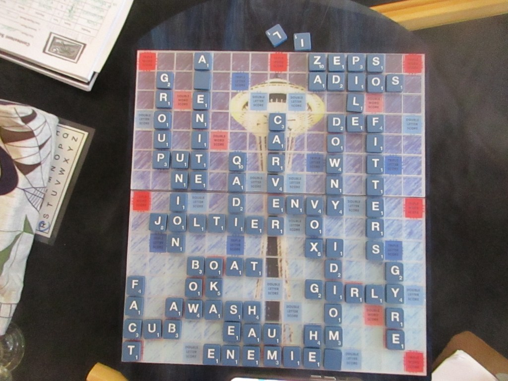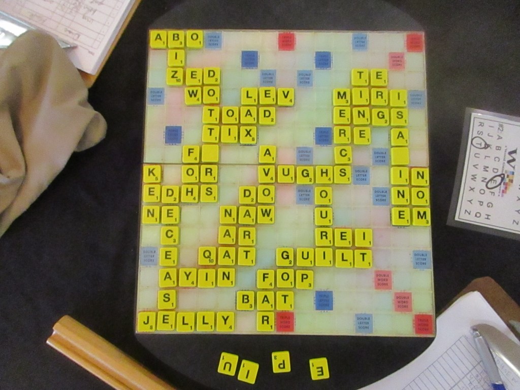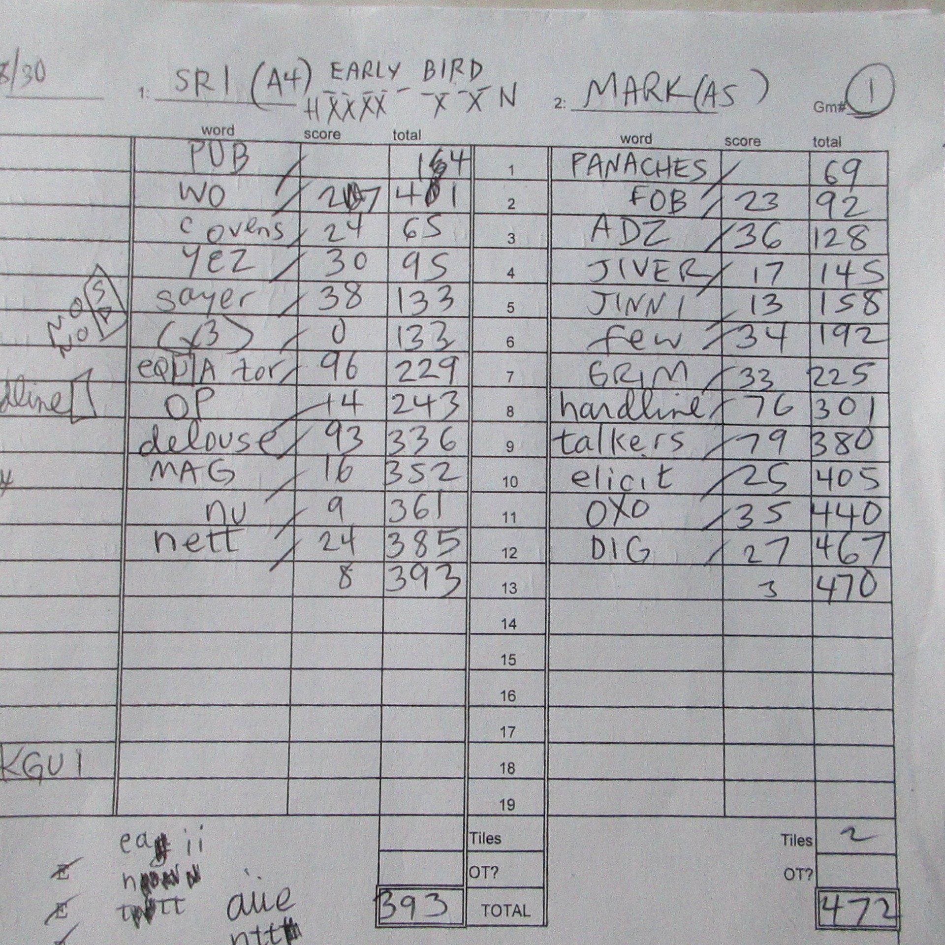 Game 3 – Opp got an early bingo REfUTING 66 and I scrambled back but almost blew it by trying “JEONS” which she knew to be phony so sent it off. I took the lead soon after with (S)OOTIER 66 and I let her comeback attempt “TEENLIkE” 62 go unchallenged as I could win without risking a challenge. We did a quick courtesy recount and found no errors. 10-point WIN. She remembered playing me 11 years ago (!) when she lost by 1 in a recount. Some games you don’t forget, but I forgot that one.
