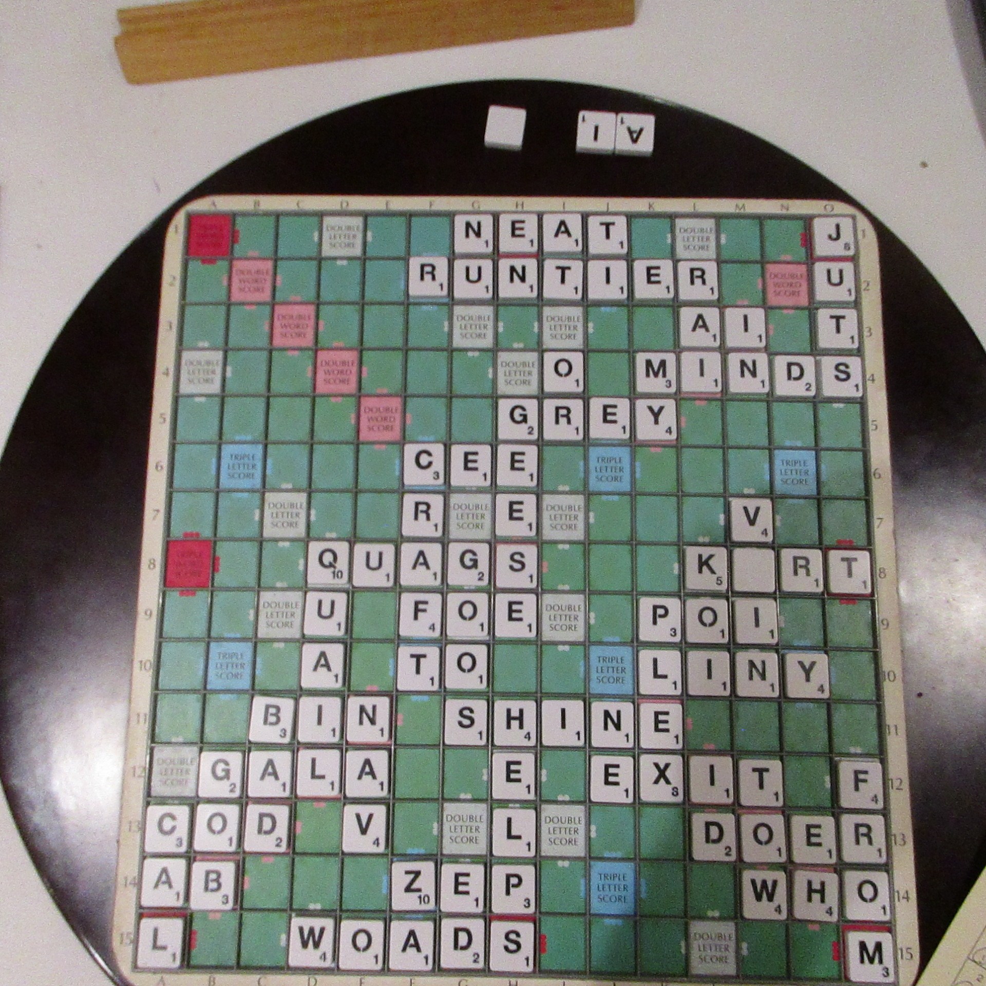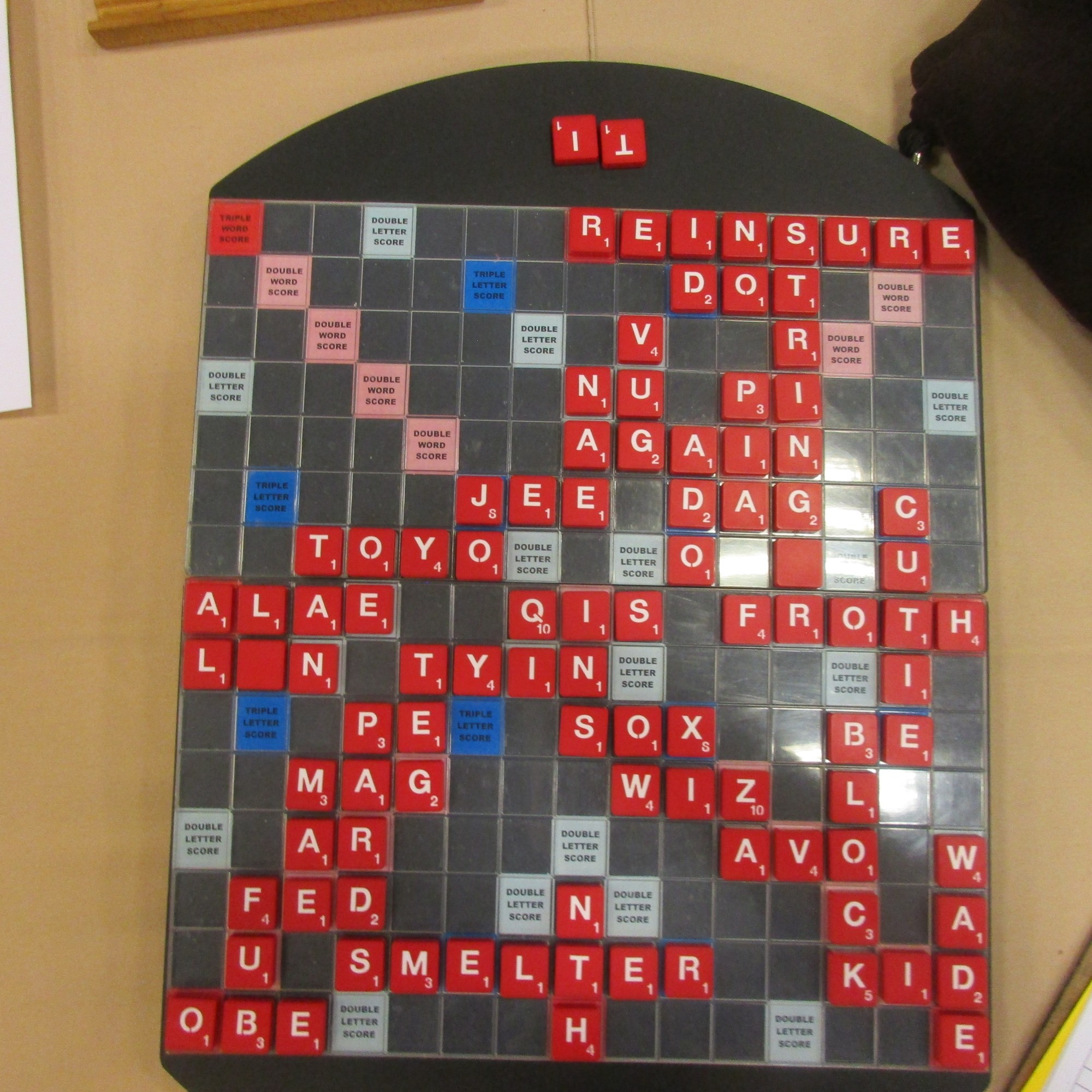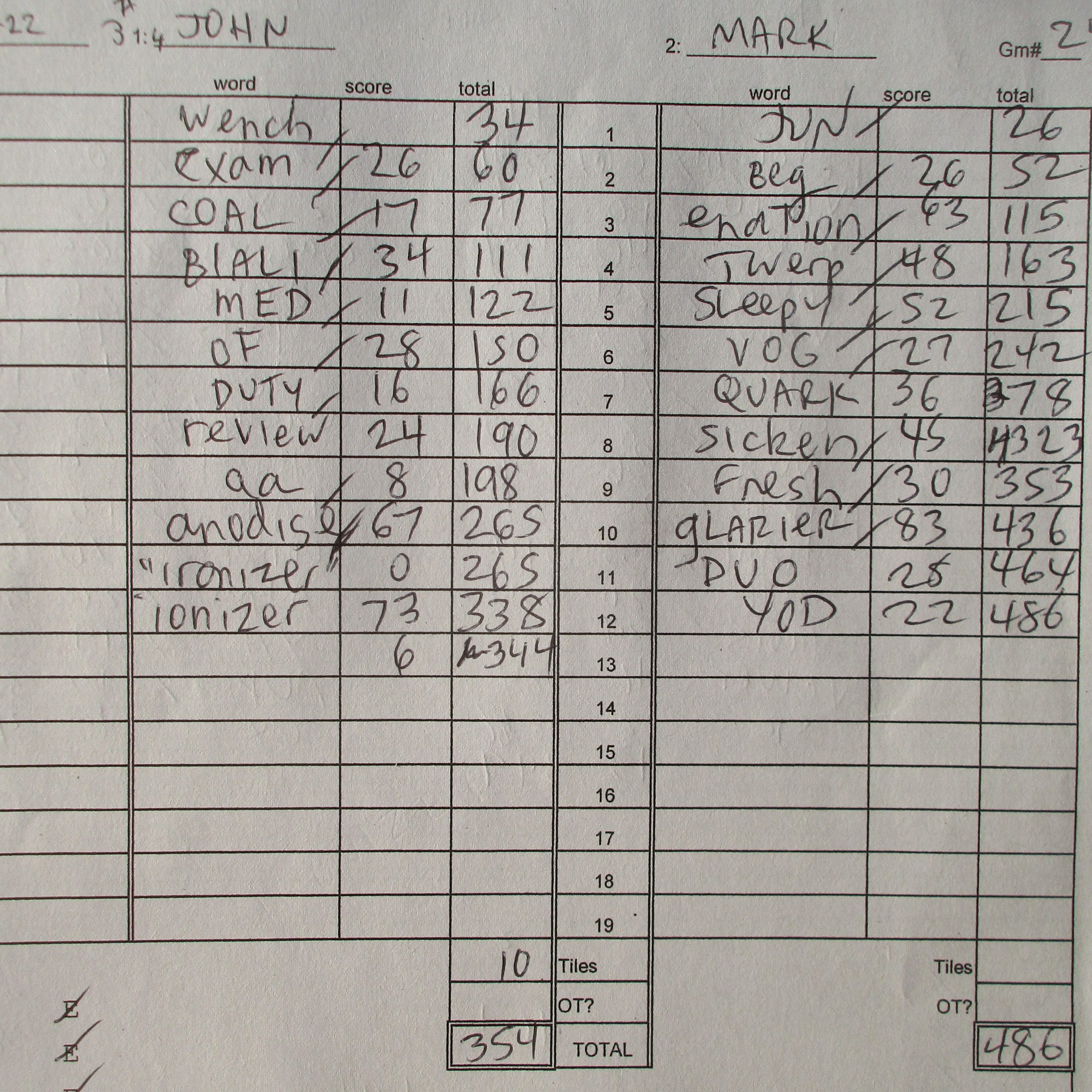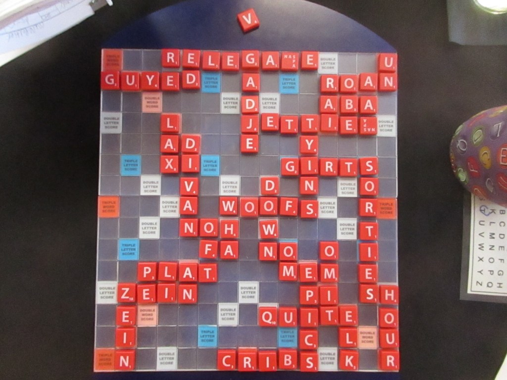 Game 3 – Opp got an early bingo REfUTING 66 and I scrambled back but almost blew it by trying “JEONS” which she knew to be phony so sent it off. I took the lead soon after with (S)OOTIER 66 and I let her comeback attempt “TEENLIkE” 62 go unchallenged as I could win without risking a challenge. We did a quick courtesy recount and found no errors. 10-point WIN. She remembered playing me 11 years ago (!) when she lost by 1 in a recount. Some games you don’t forget, but I forgot that one.