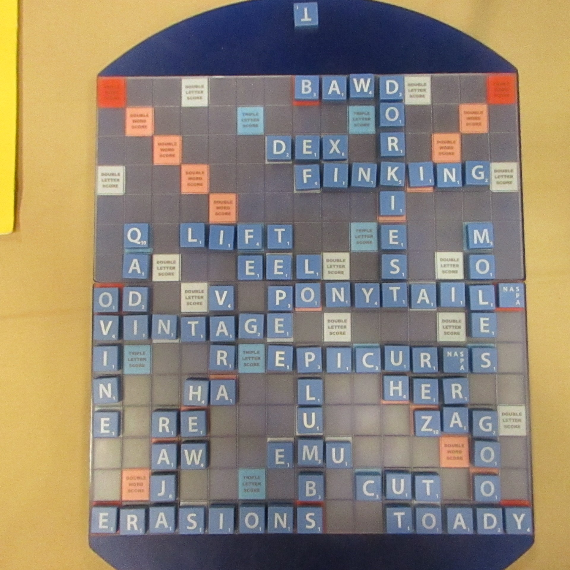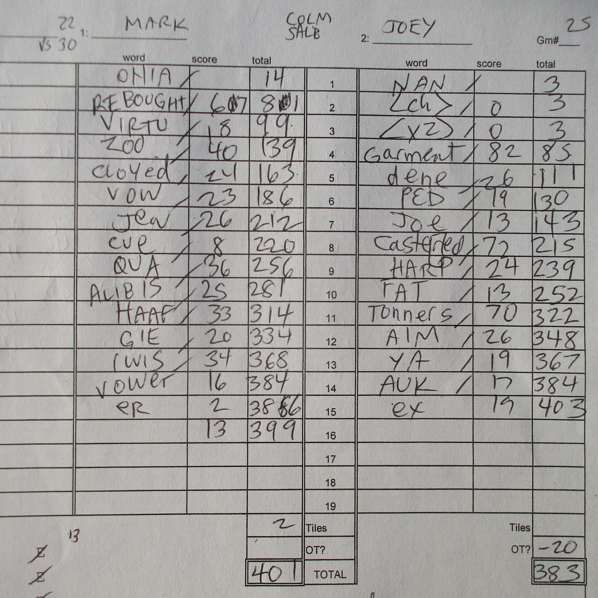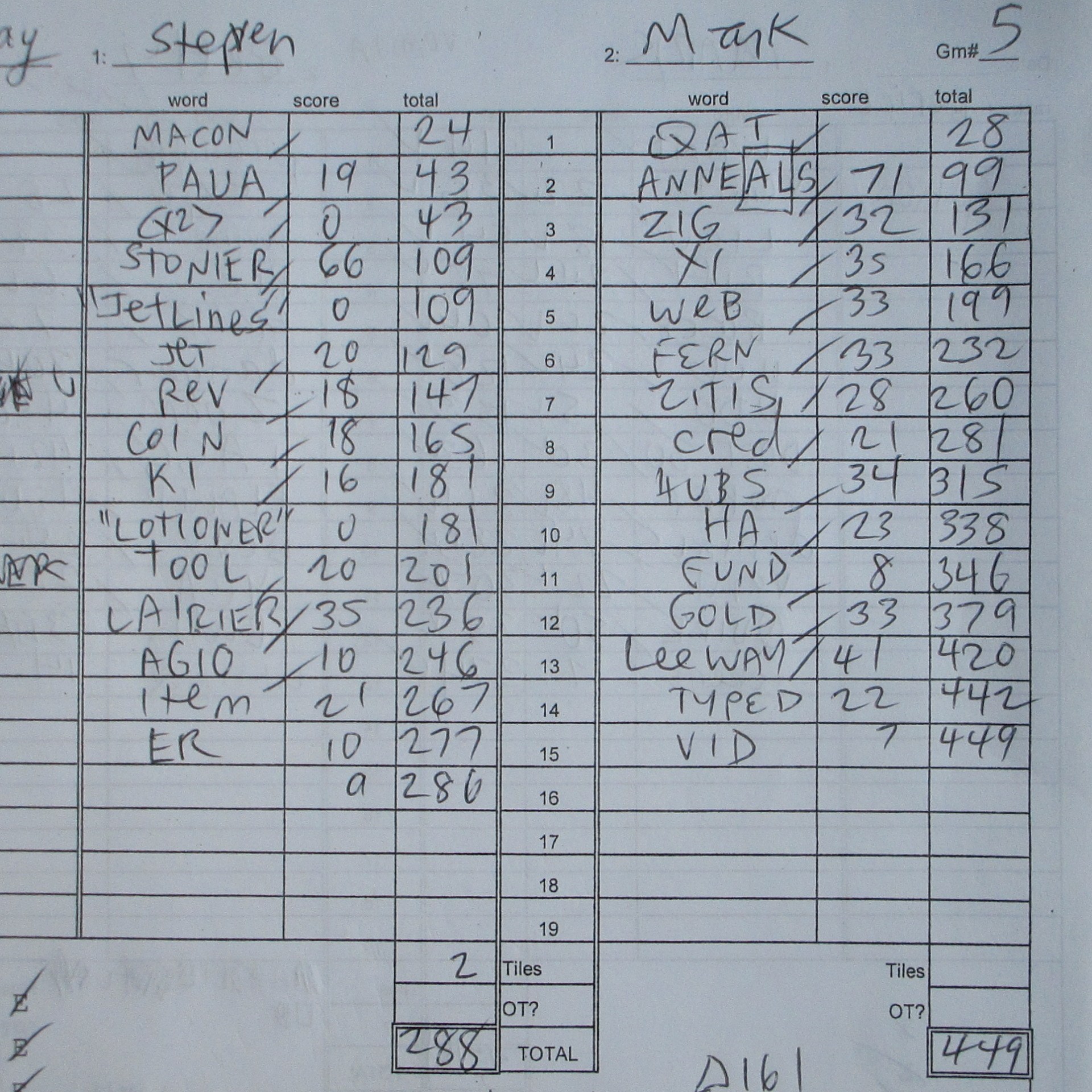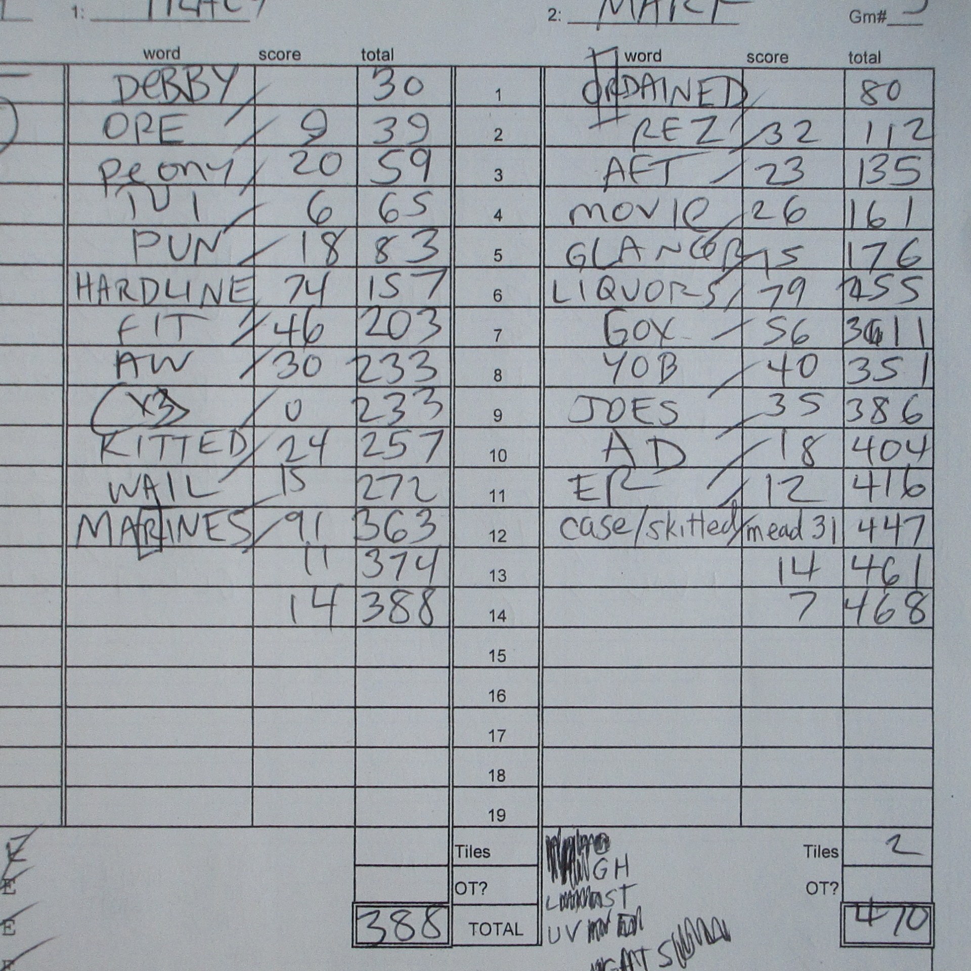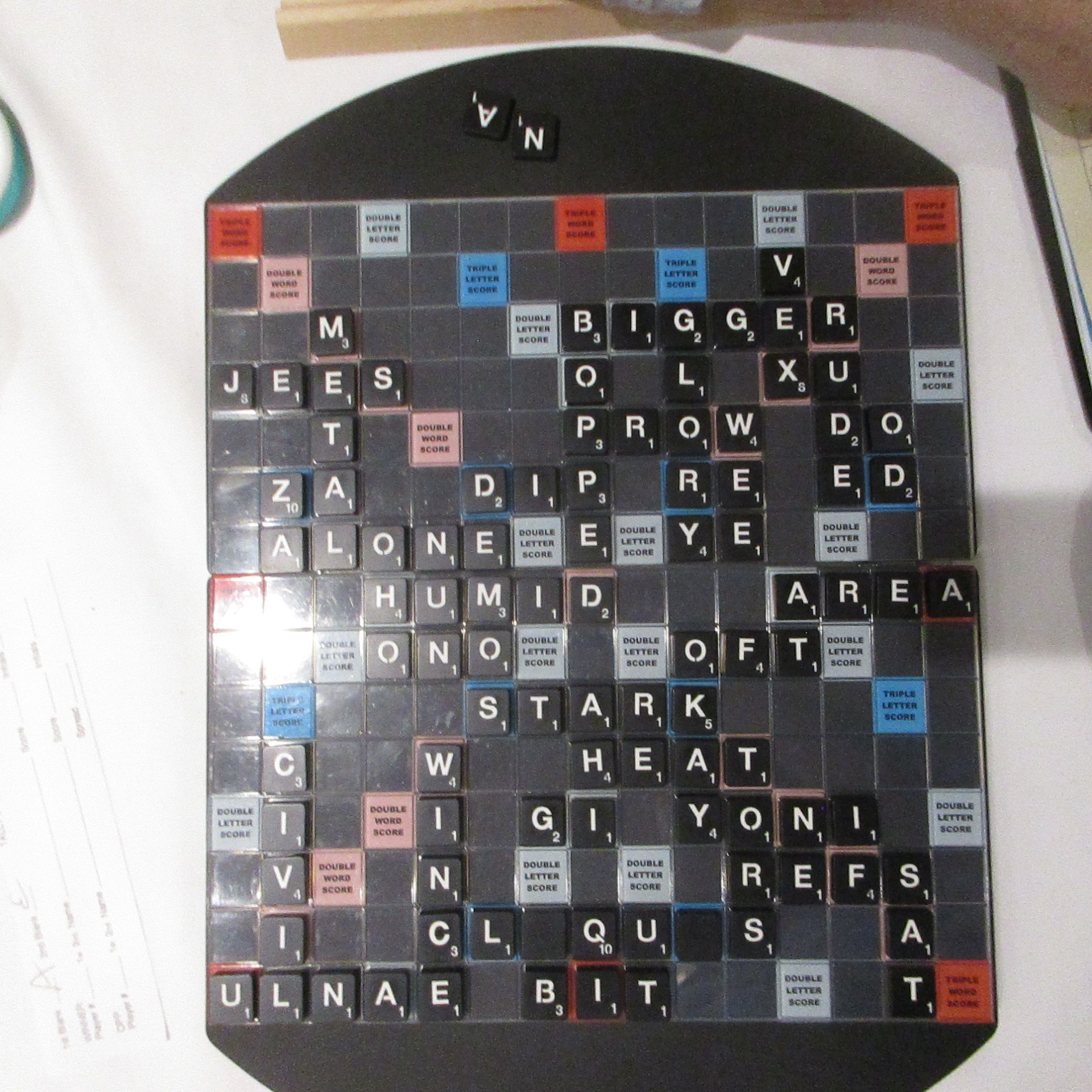 Game 20 – worth an extra $100 to the winner. Looking bleak early when Tracy gets SPECIAL 78 and INFLATER 74. My HEX 46 and desperation blank usage Q(U)EeReR 50 pale. Her late game bingo INTEGRAl 70 ices it on one of the few bingo lanes existant. Ugly LOSS.