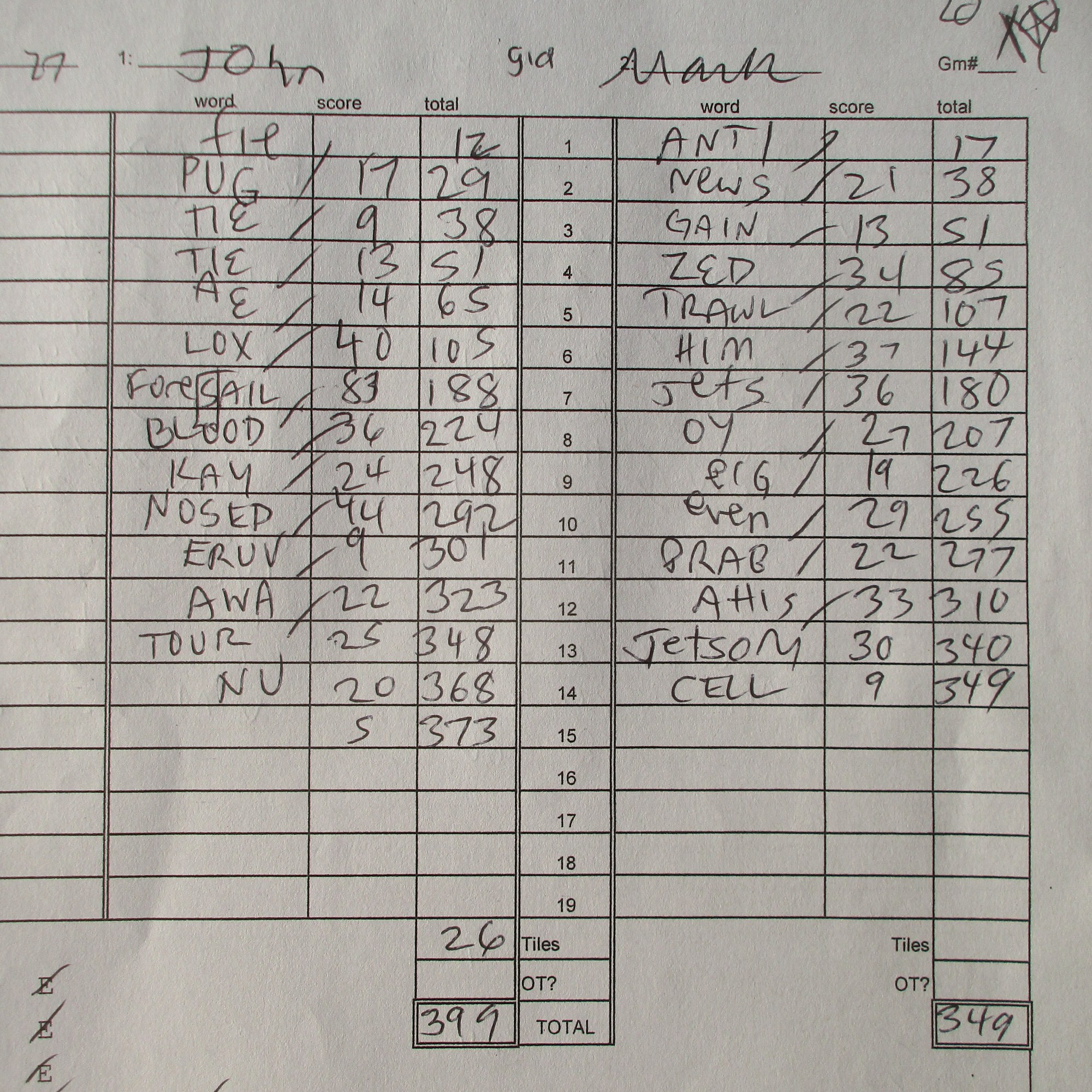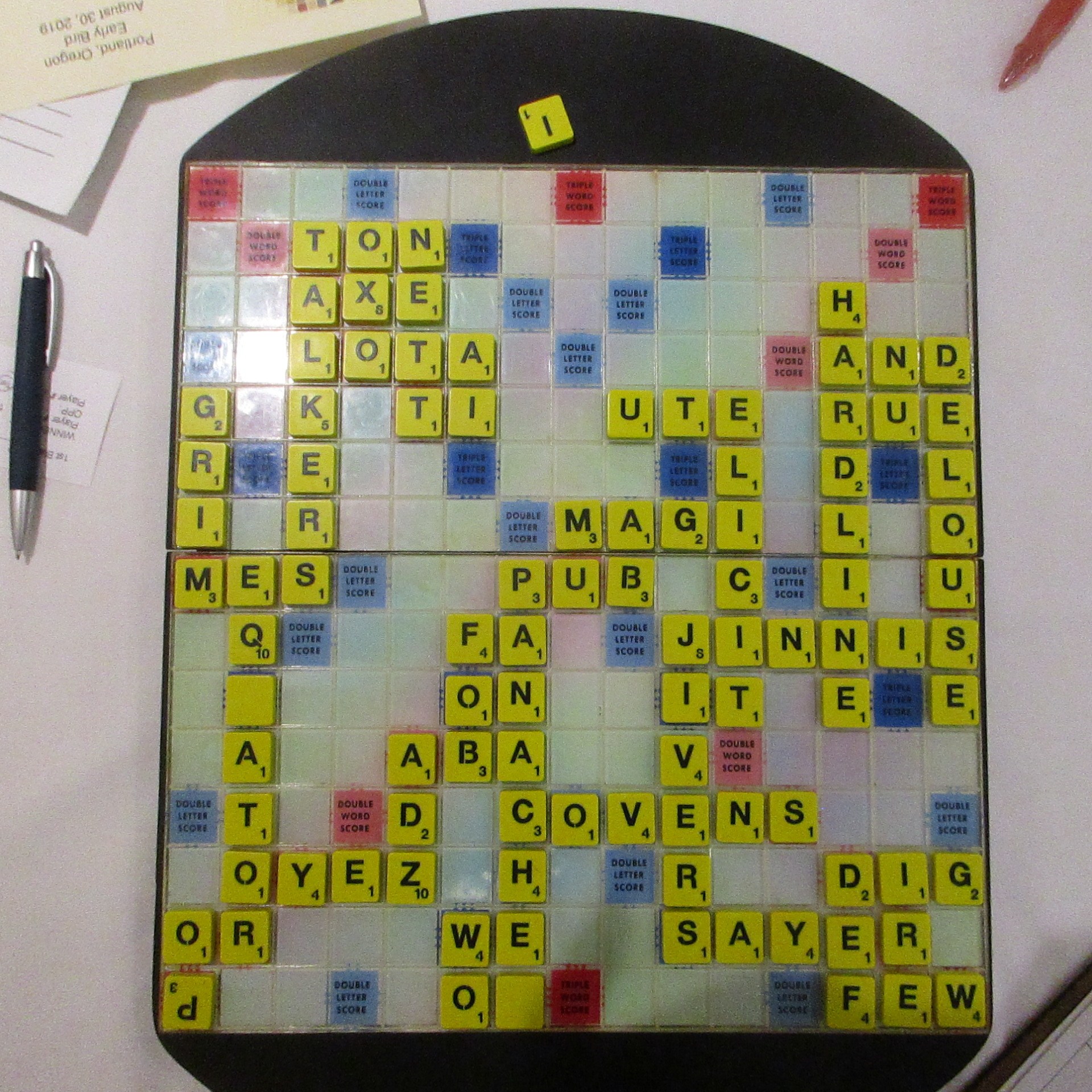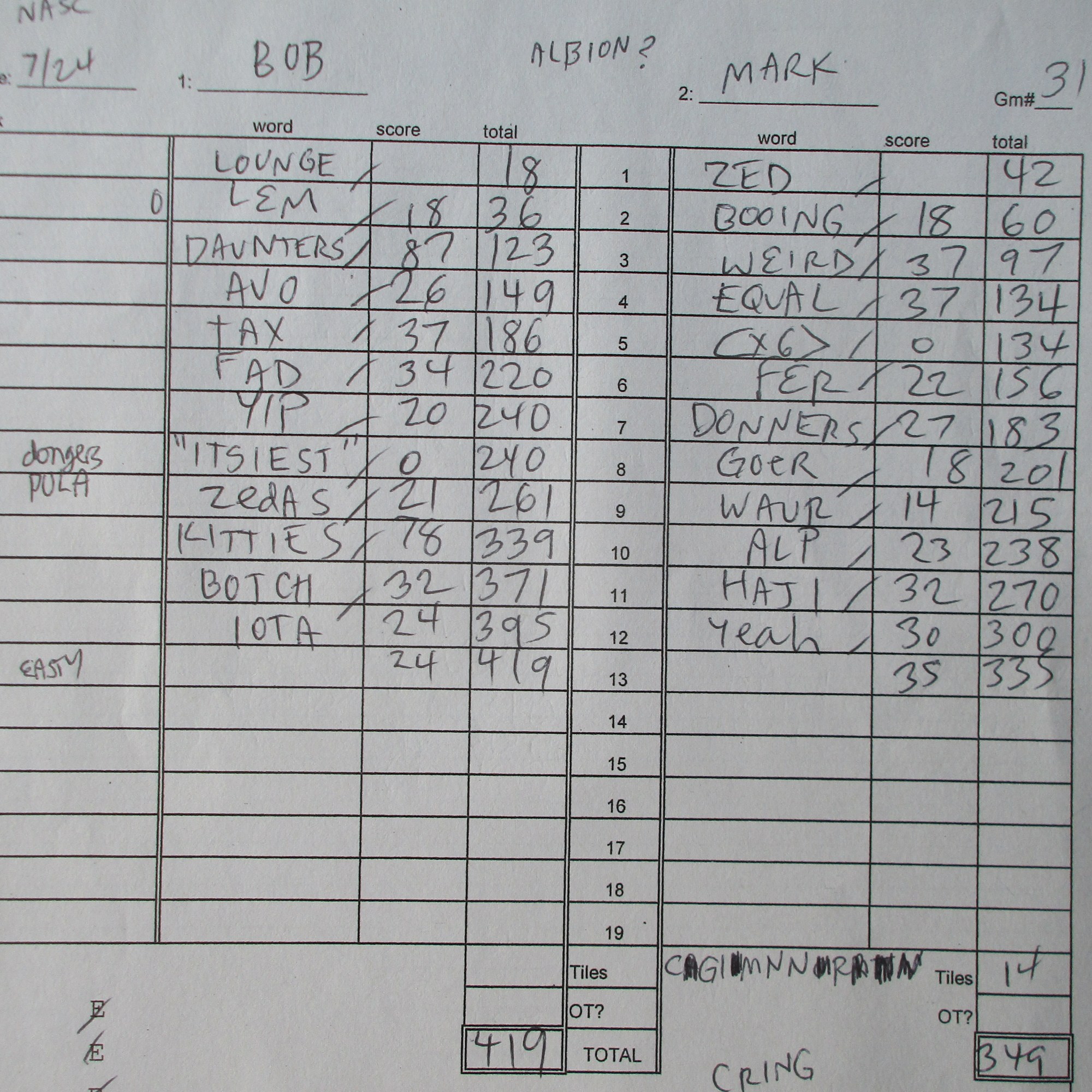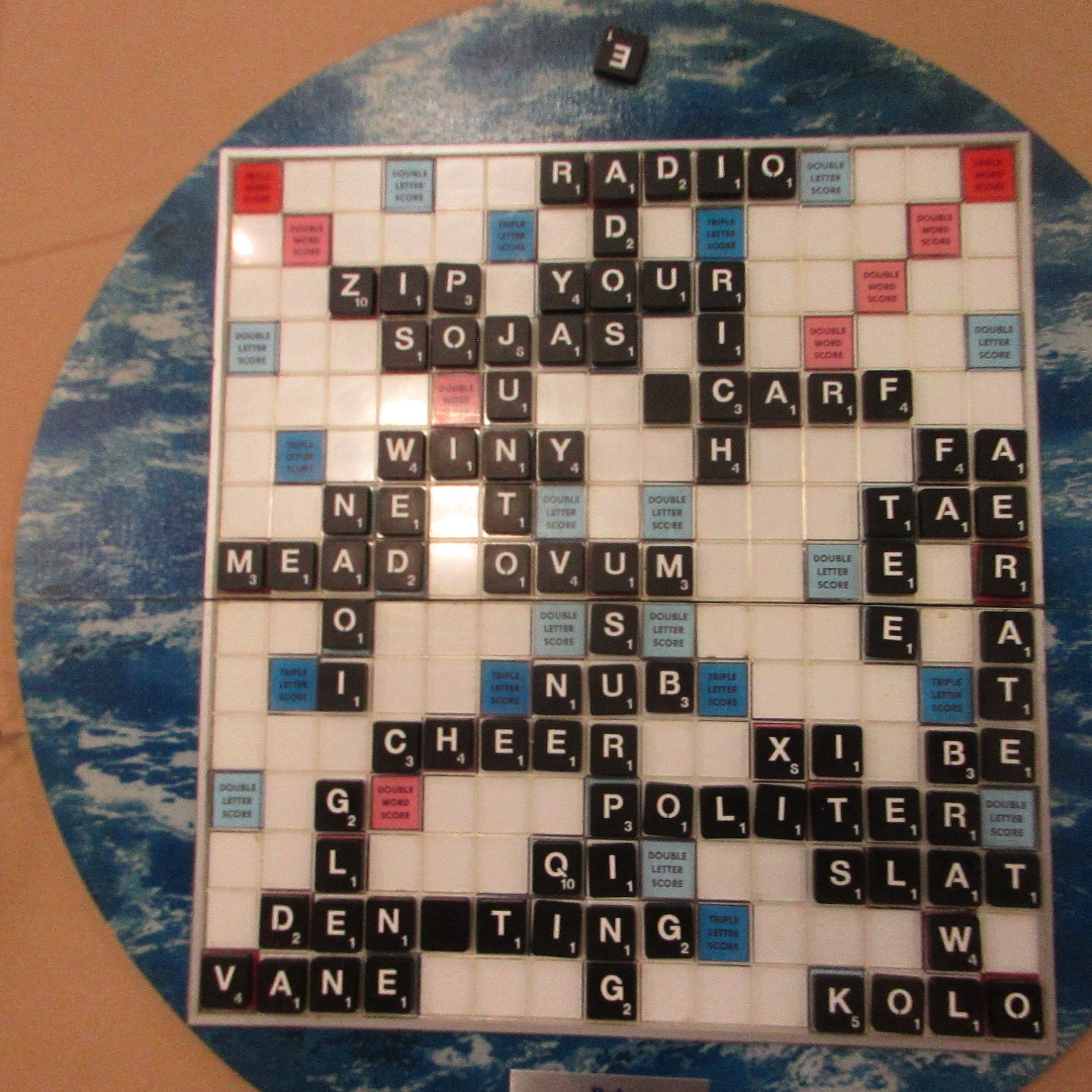 Game 20 – worth an extra $100 to the winner. Looking bleak early when Tracy gets SPECIAL 78 and INFLATER 74. My HEX 46 and desperation blank usage Q(U)EeReR 50 pale. Her late game bingo INTEGRAl 70 ices it on one of the few bingo lanes existant. Ugly LOSS.