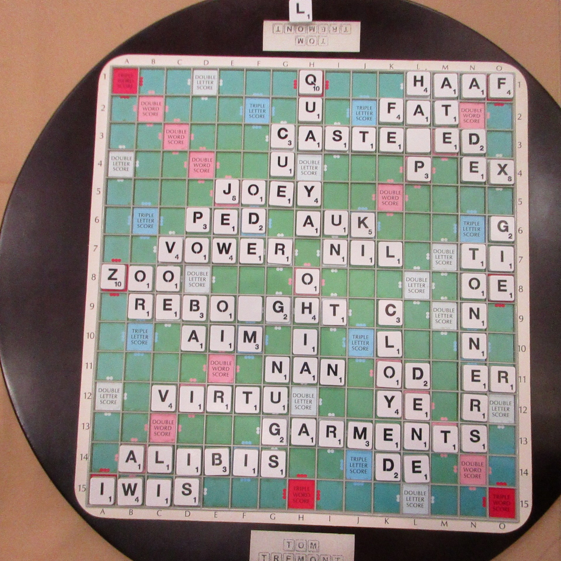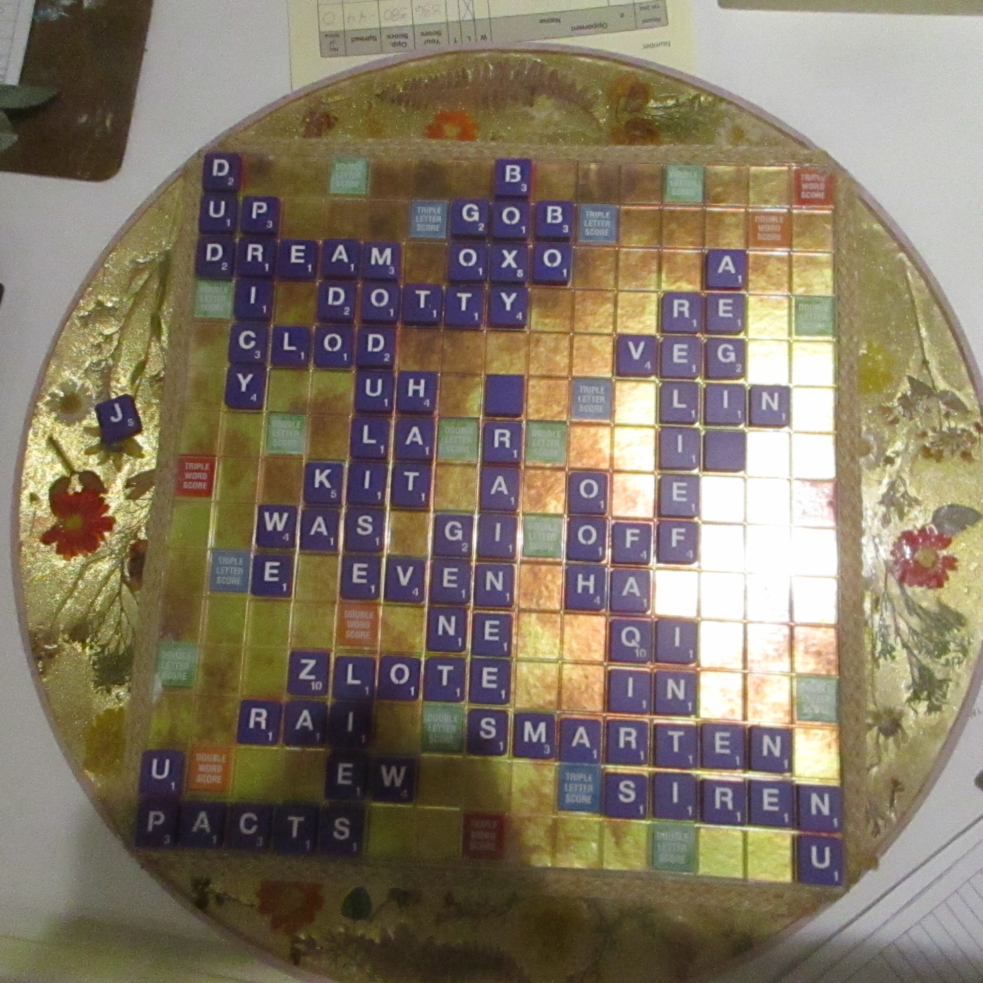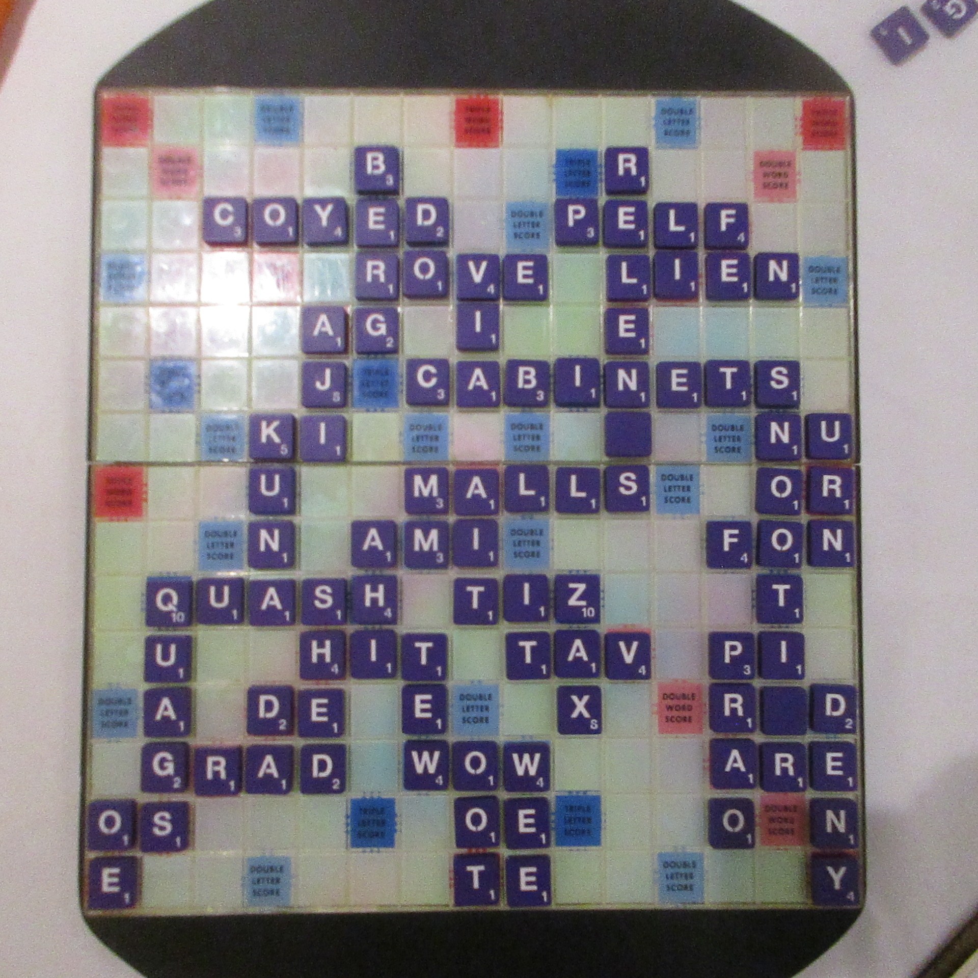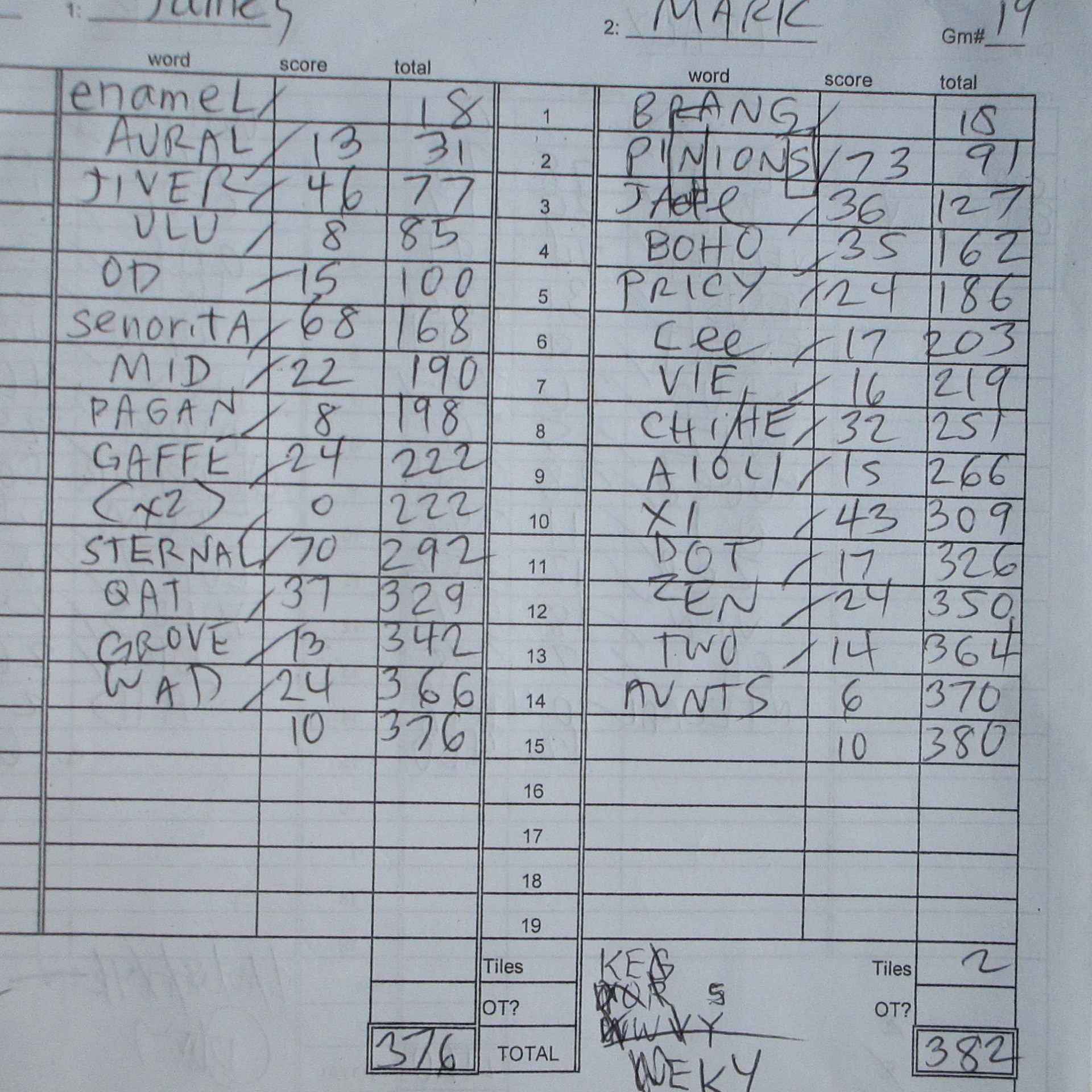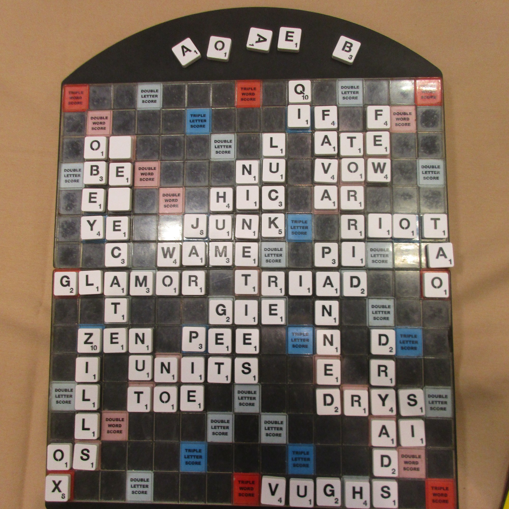 Game 20 – worth an extra $100 to the winner. Looking bleak early when Tracy gets SPECIAL 78 and INFLATER 74. My HEX 46 and desperation blank usage Q(U)EeReR 50 pale. Her late game bingo INTEGRAl 70 ices it on one of the few bingo lanes existant. Ugly LOSS.