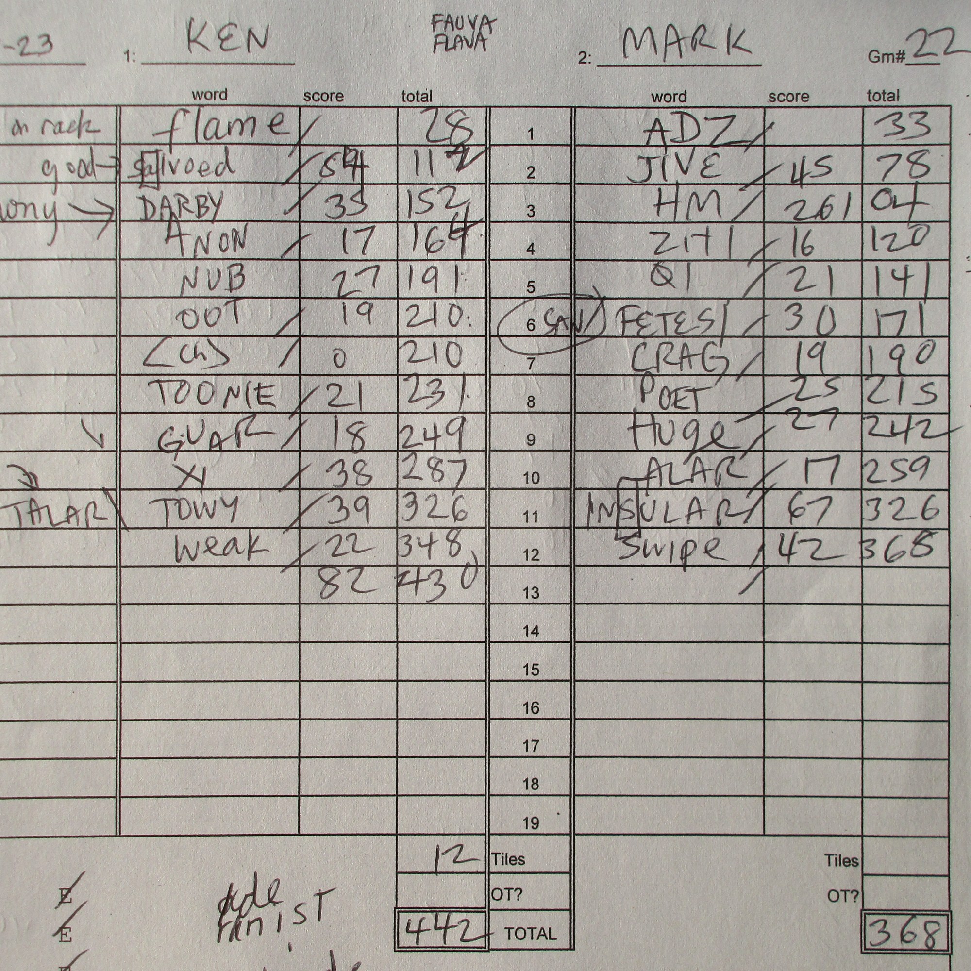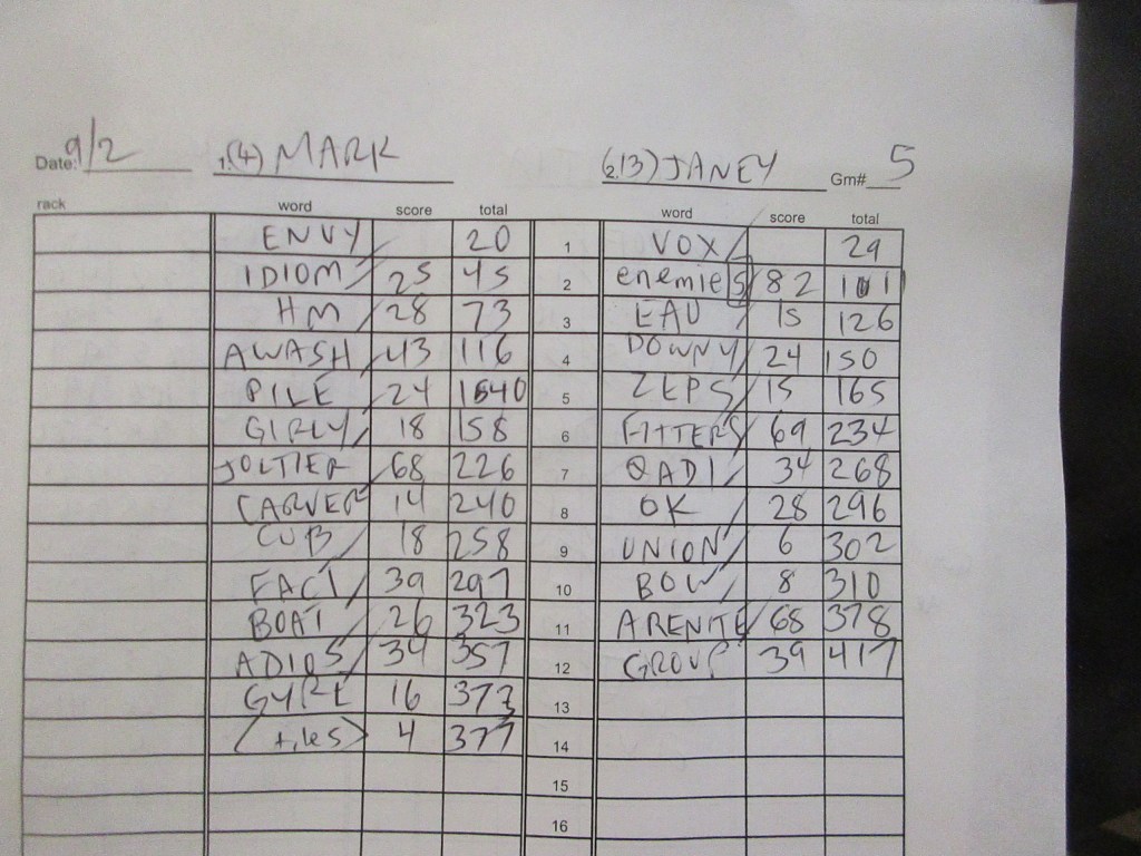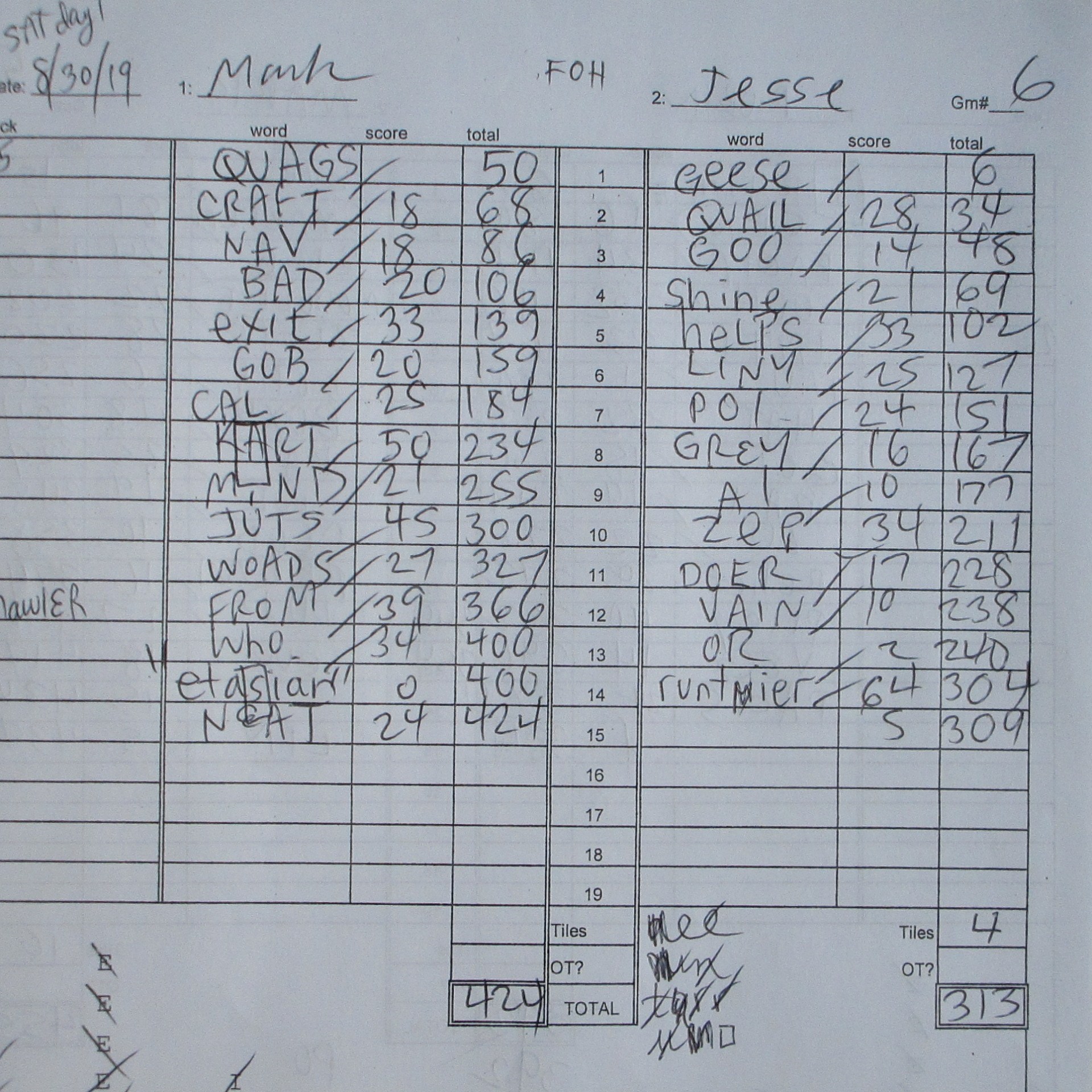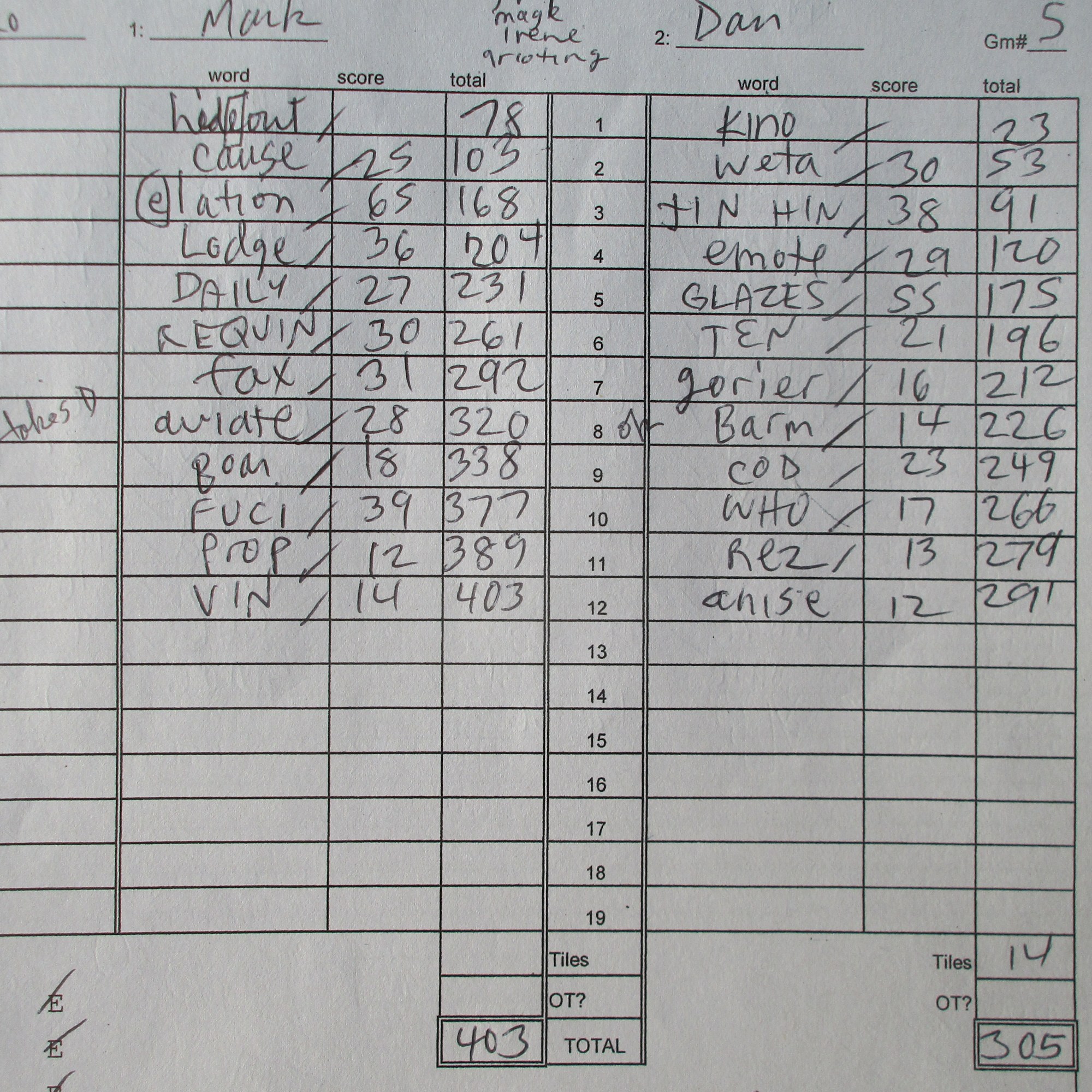 Game 20 – worth an extra $100 to the winner. Looking bleak early when Tracy gets SPECIAL 78 and INFLATER 74. My HEX 46 and desperation blank usage Q(U)EeReR 50 pale. Her late game bingo INTEGRAl 70 ices it on one of the few bingo lanes existant. Ugly LOSS.