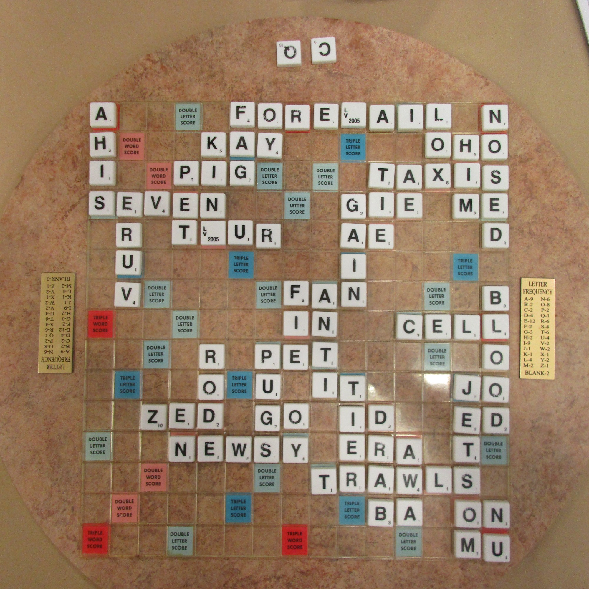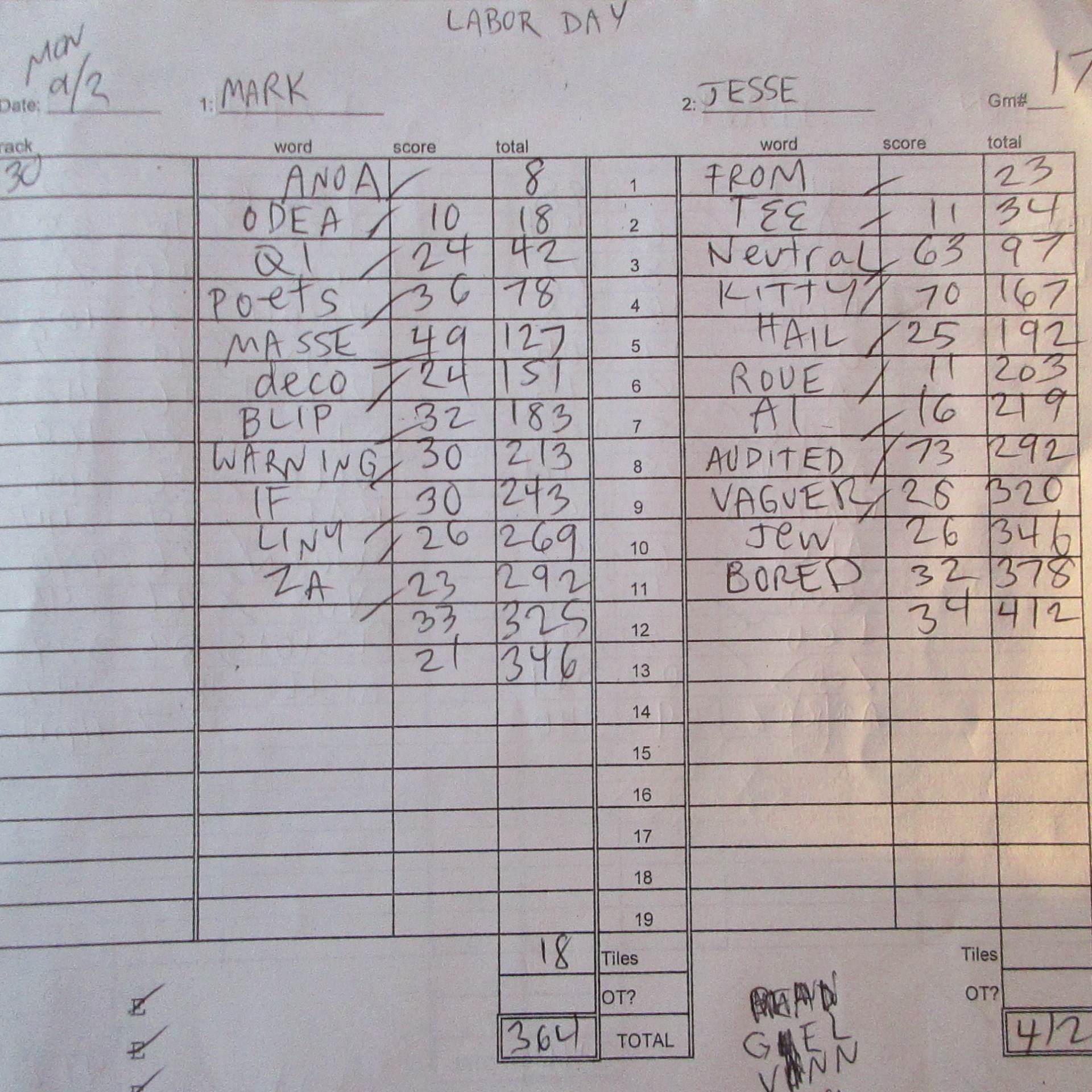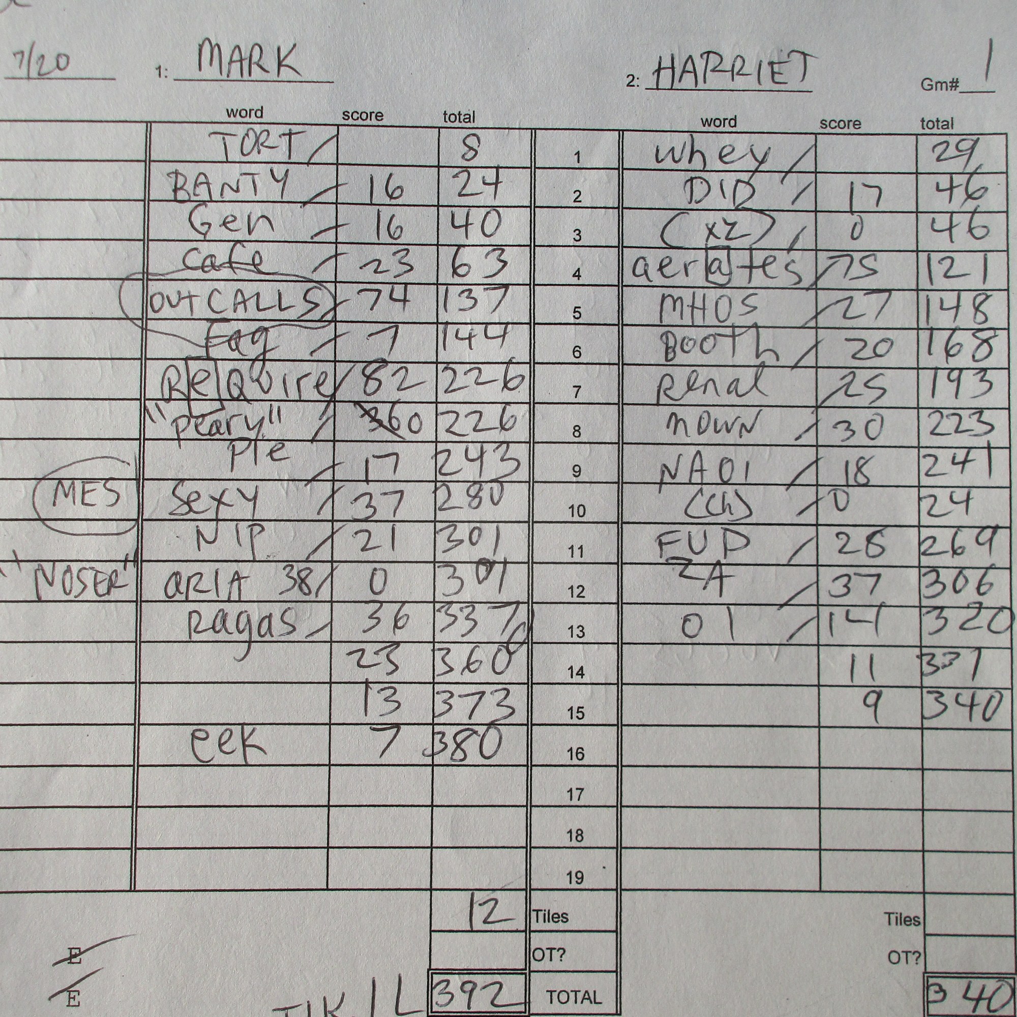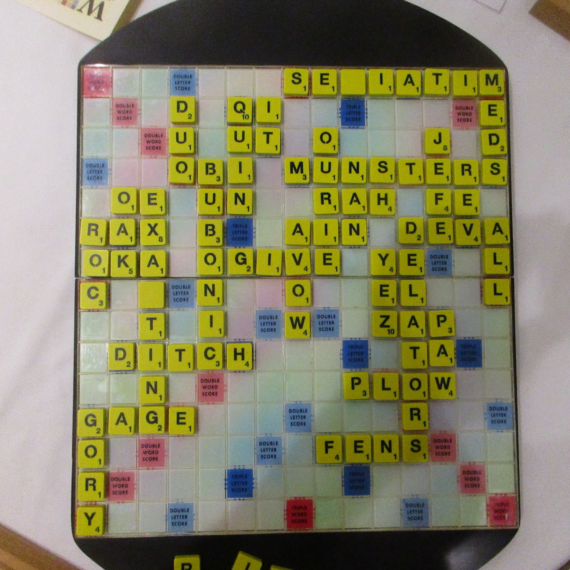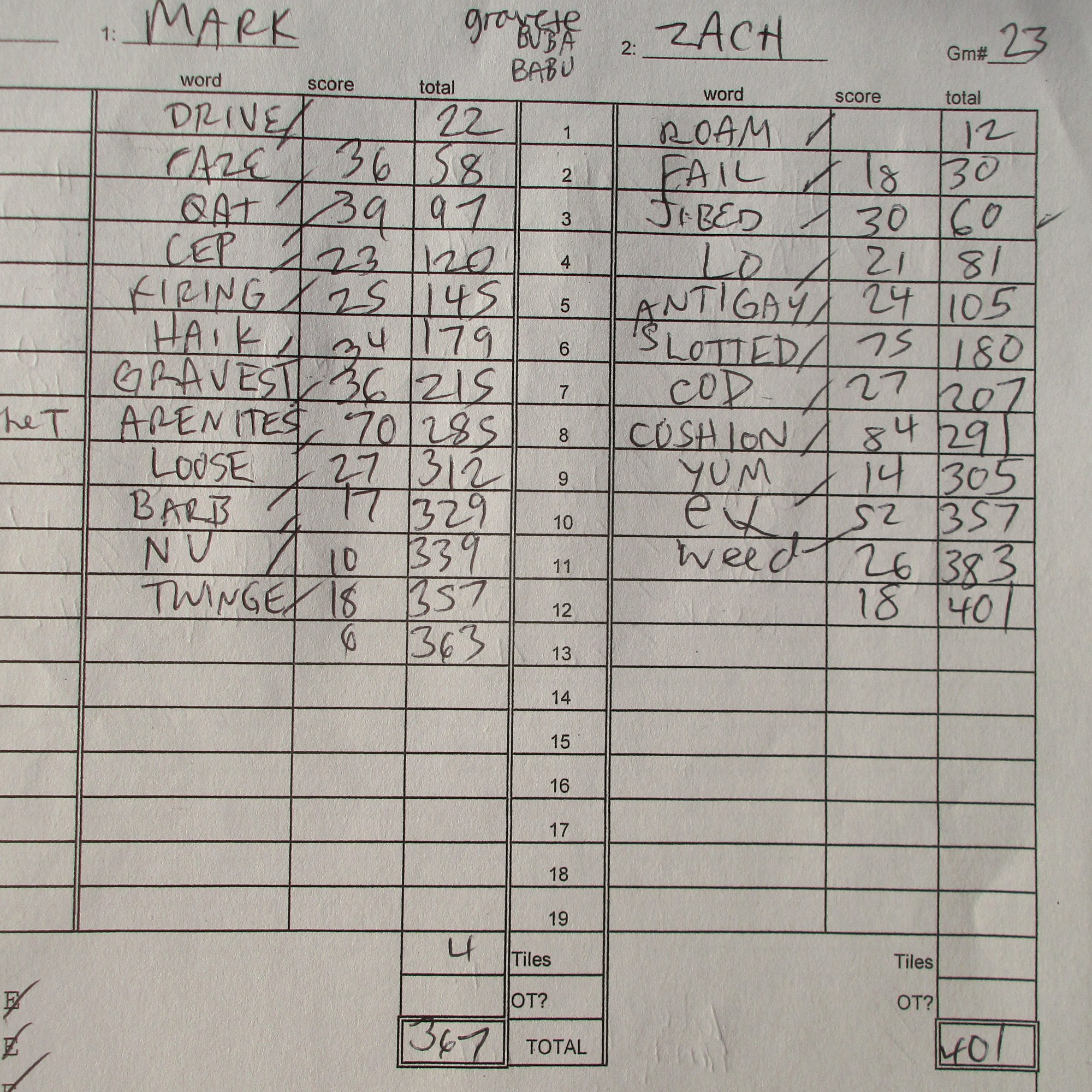 Game 20 – worth an extra $100 to the winner. Looking bleak early when Tracy gets SPECIAL 78 and INFLATER 74. My HEX 46 and desperation blank usage Q(U)EeReR 50 pale. Her late game bingo INTEGRAl 70 ices it on one of the few bingo lanes existant. Ugly LOSS.