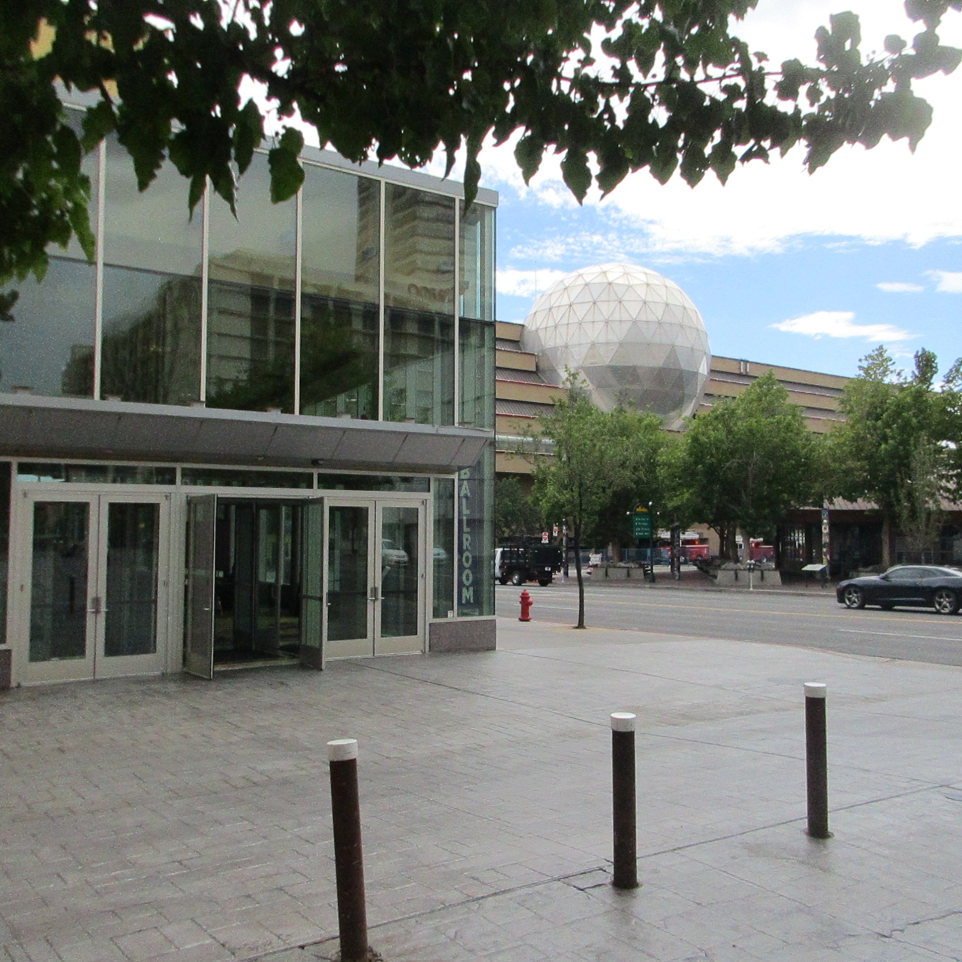 Tournament venue, Reno Convention Center Ballroom, entrance looking east (Left hand photo) with the National Bowling center dome in background. Right-hand photo is looking west from the Ballroom entrance, view of Silver Legacy hotel/casino. Nigel & I had rooms on the 29th floor of the 36 floor hotel. This is one of my “homes” for my video poker jaunts, so we scored a comped suite and room. Tourney entry fee was $200.