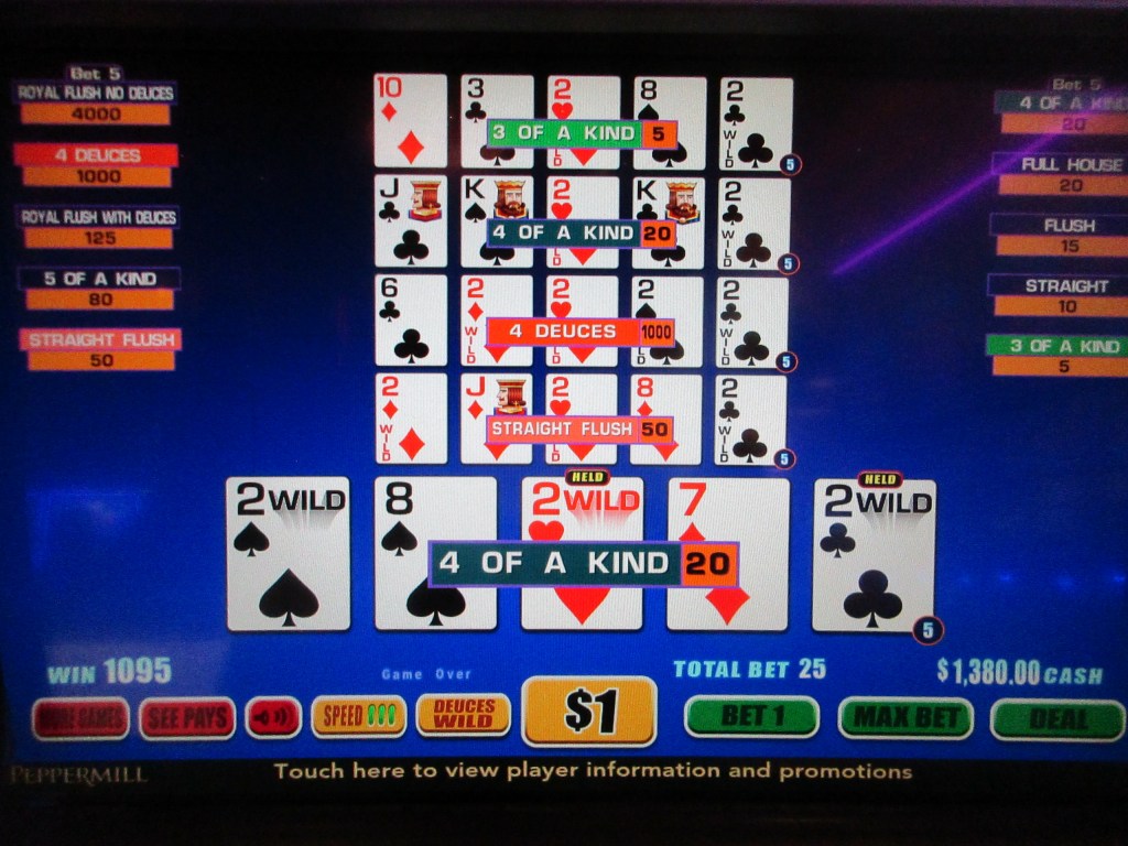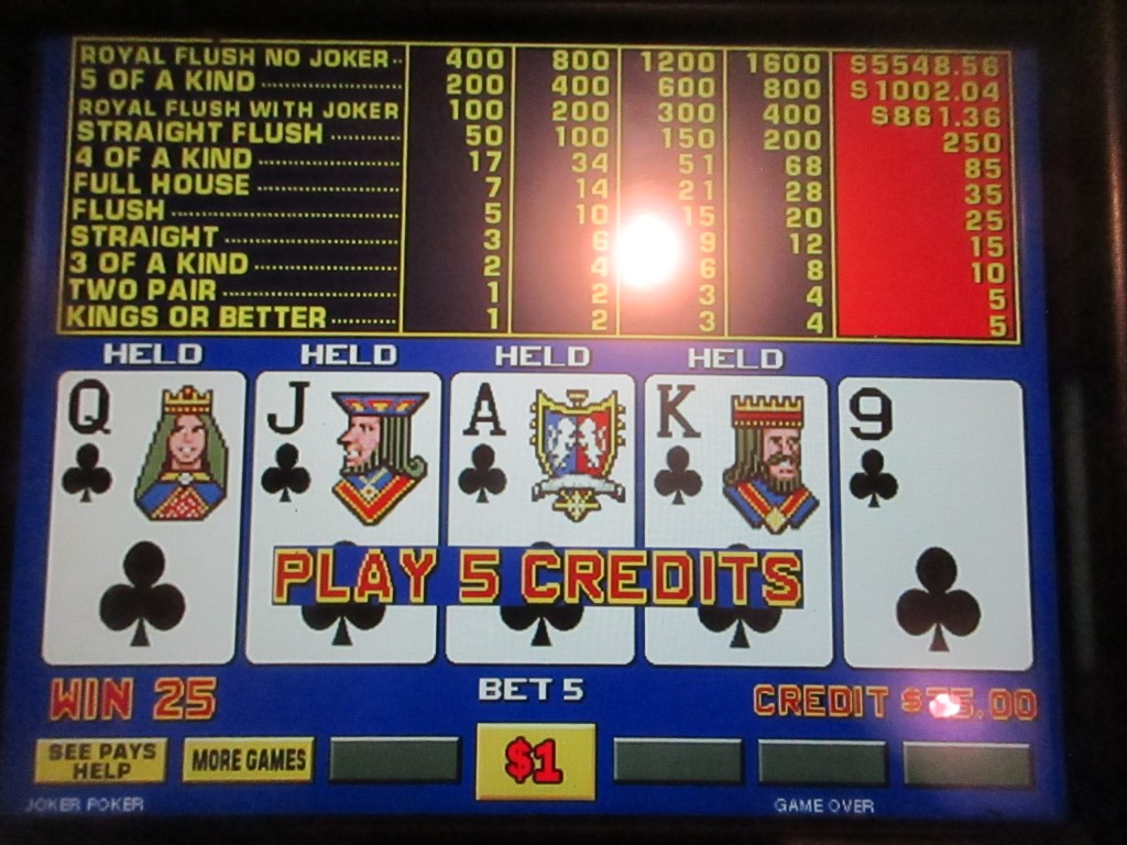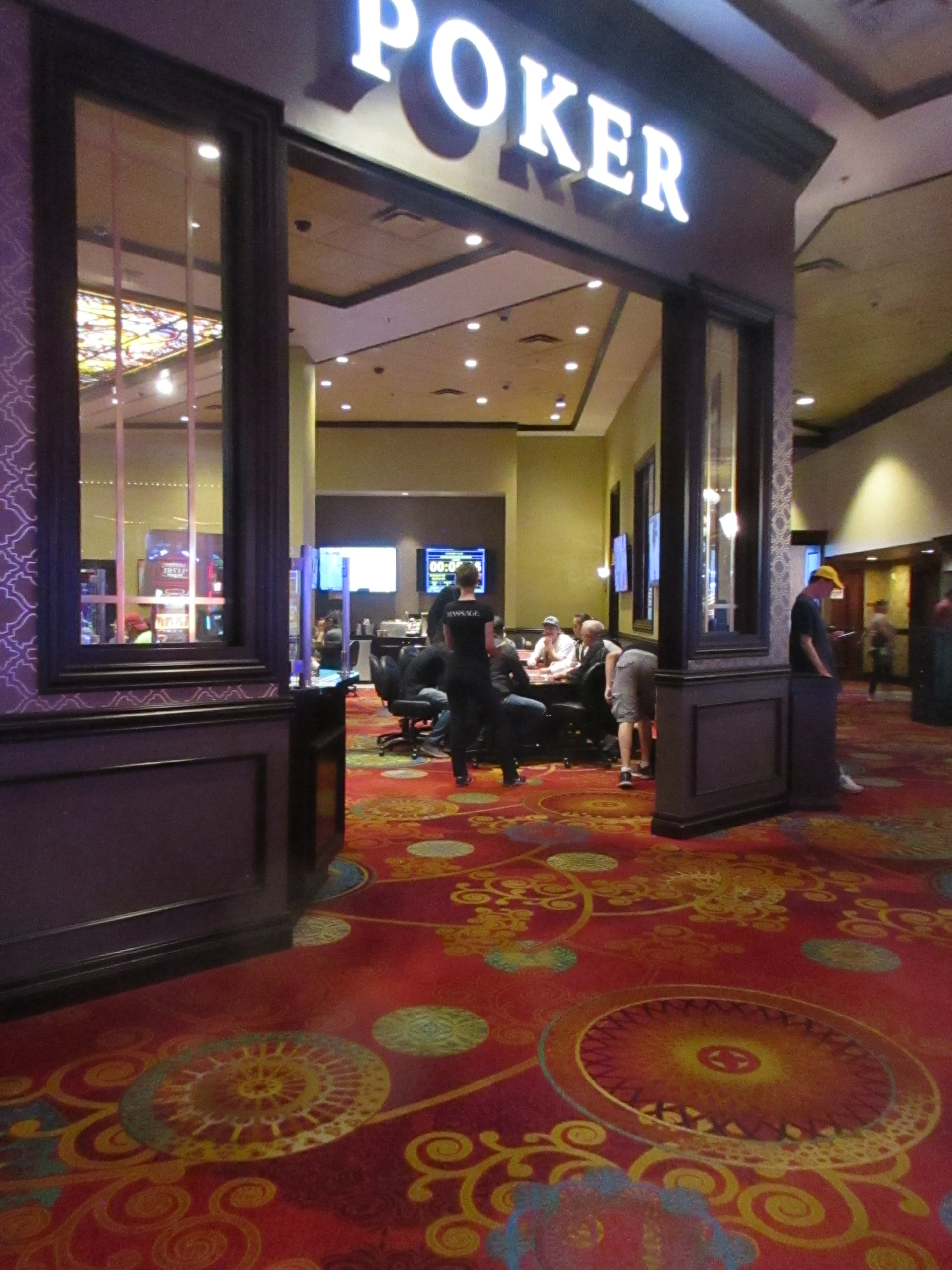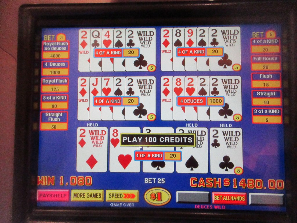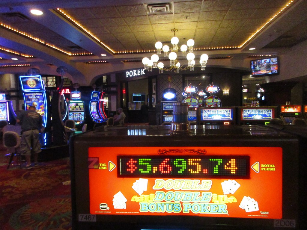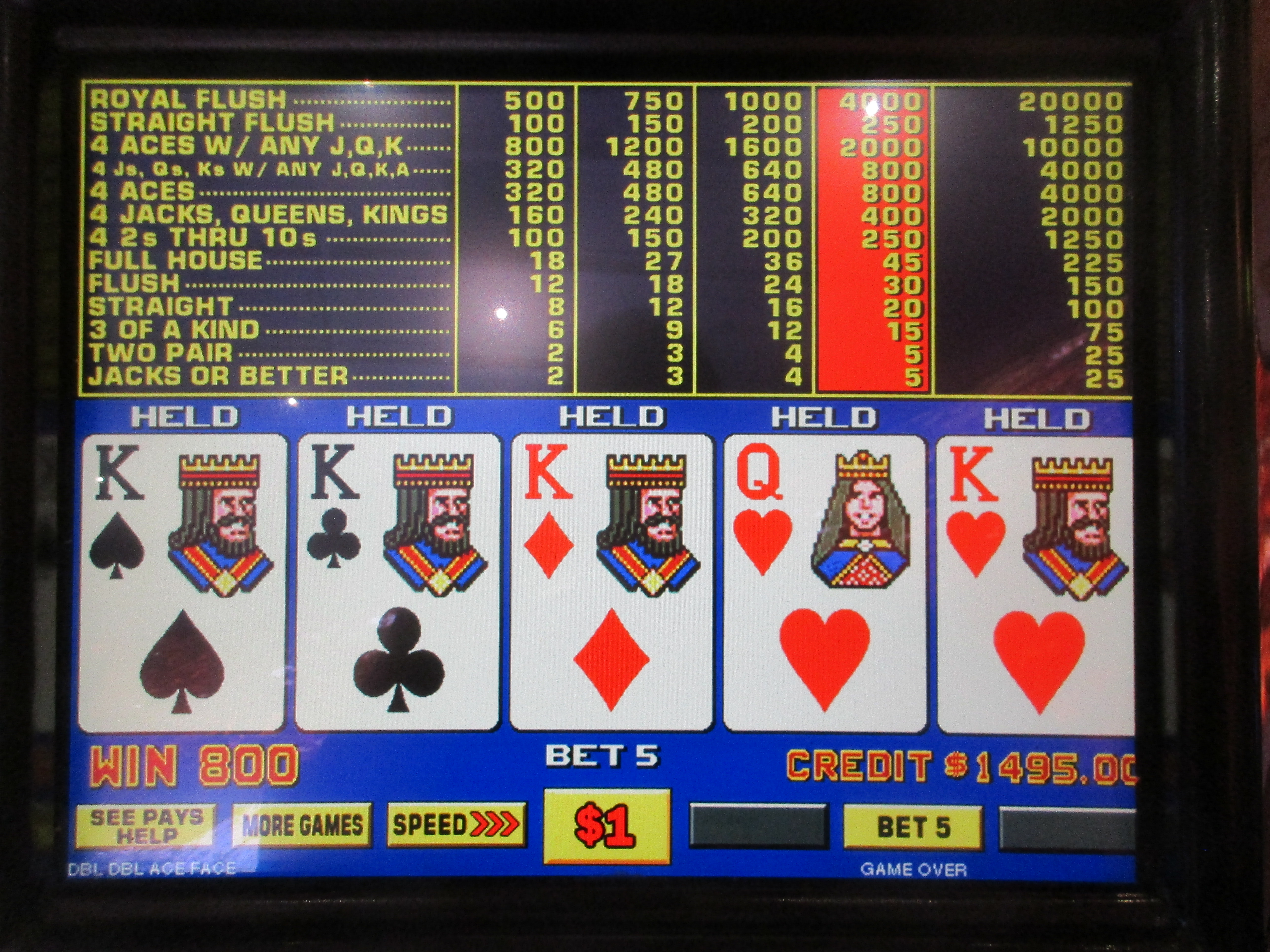 Mike & I got into video poker seriously I estimate around year 2000. We enjoy playing on adjacent machines, sometimes sharing stories, but we stop playing if it’s more than a sentence or two so that we don’t mess up our concentration on holding the correct cards. SO while we are playing we only say things like “quads” or “bonus quads” and we may or may not look up from our screen to look at the other’s screen. It’s kind of a shared “pulse” of how it’s going without undue interruption. There’s the moments you can’t help but notice when one of us sighs or mumbles a profanity when having to reach into our pocket for more hundreds to feed the machine when one has a “credit situation:” meaning 0 credits. Then there’s the announcement of “the night before Christmas!”, a mandatory announcement when you are dealt 4 parts to the Royal Flush, there’s a brief hesitation and imagined drum roll as two pairs of eyes watch to see if the 5th Royal Flush card comes in on the draw. Even being dealt three Aces is a stop and watch type announcement as that 4th Ace plus possibly the kicker is a very lucrative jackpot in the games we play. Anyhow this synchronization is what we’ve developed over this last quarter century. And Lin has become part of our group think too since she’s been playing for 15 or more of those years.