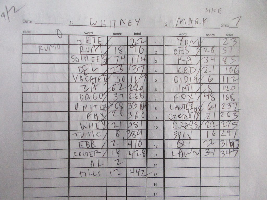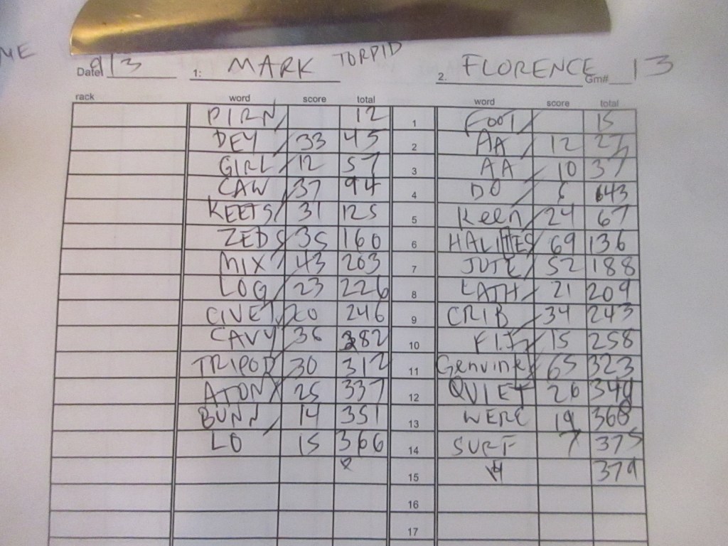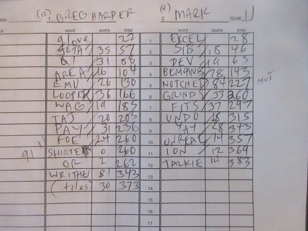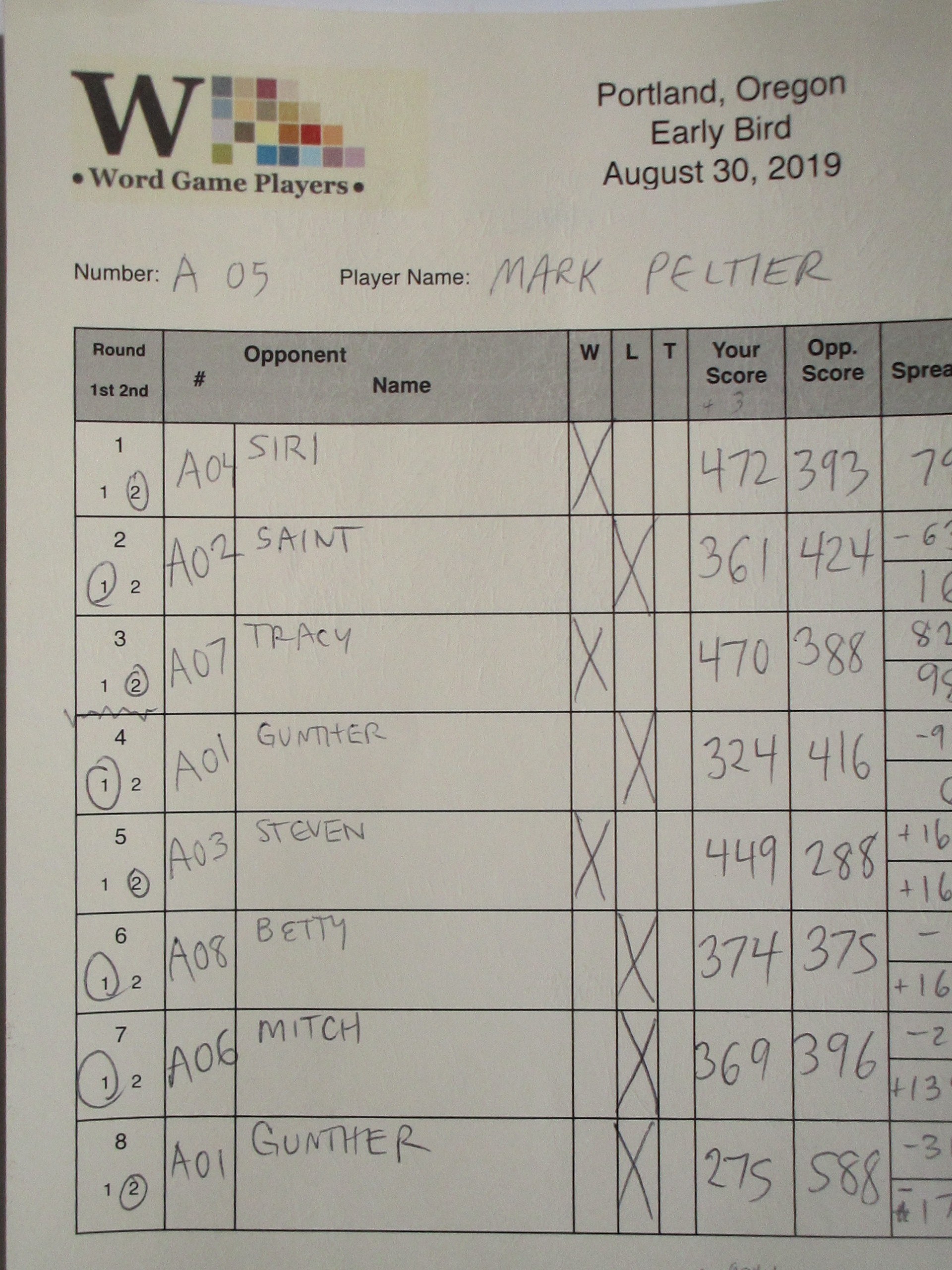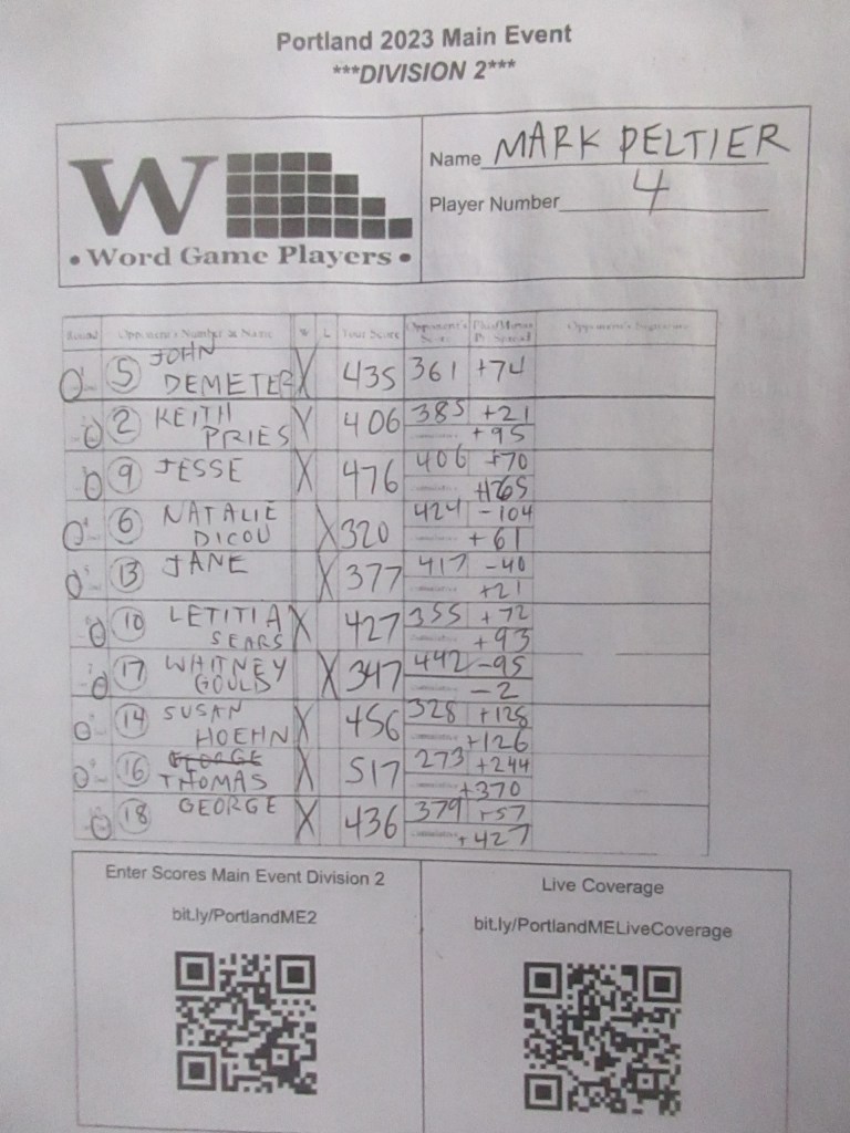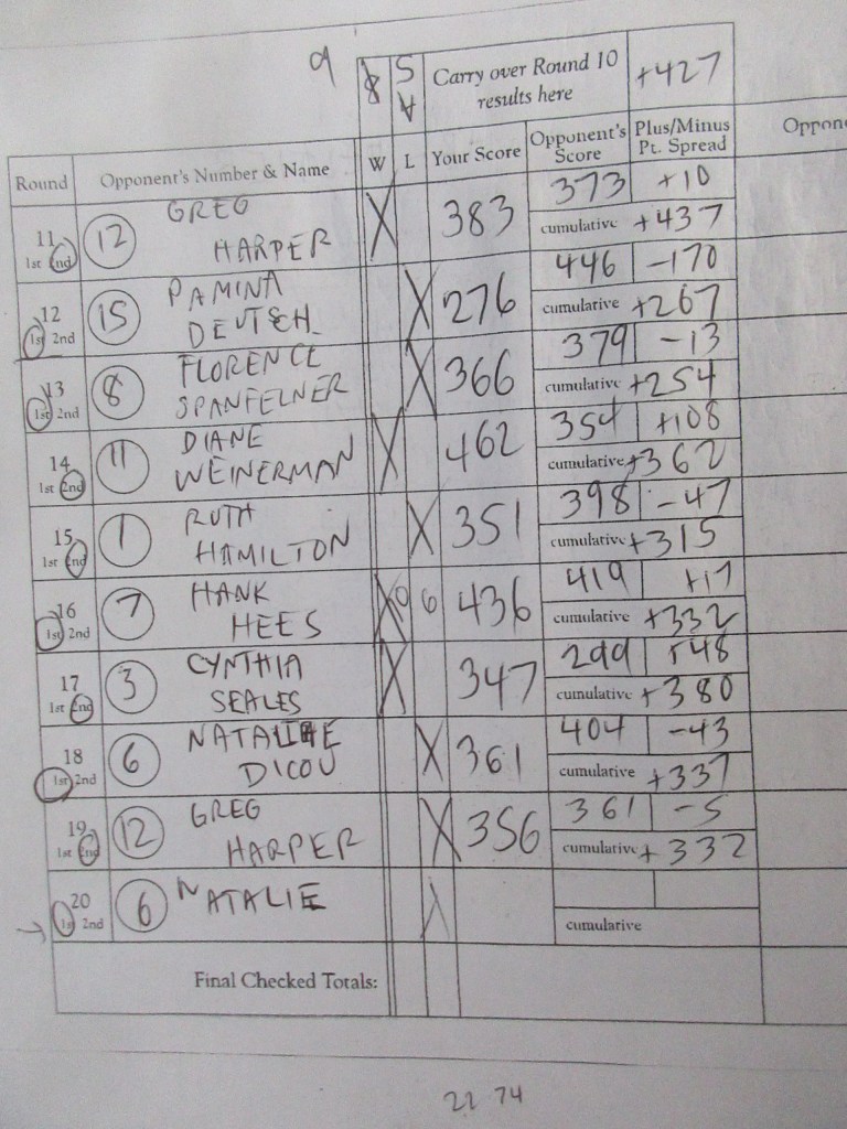 I’m 13-7, 2nd place to Tracy’s 14-6. My envelope in the pic reads Div 2 2nd place $310. Cash inside 15 x $20’s + one $10 (probably already in my wallet at this point). Results at this website: http://wordgameplayers.org/ratings/index.php?c=pu&a=tr&tournamentID=637&ratingType=Standard I averaged 385 pts per game in Early Bird too opp’s 407. I averaged 383 ppg in Main event to opp’s 359 combined. I didn’t do bingo counts nor other stats for this tourney. Final scoresheet front & back: