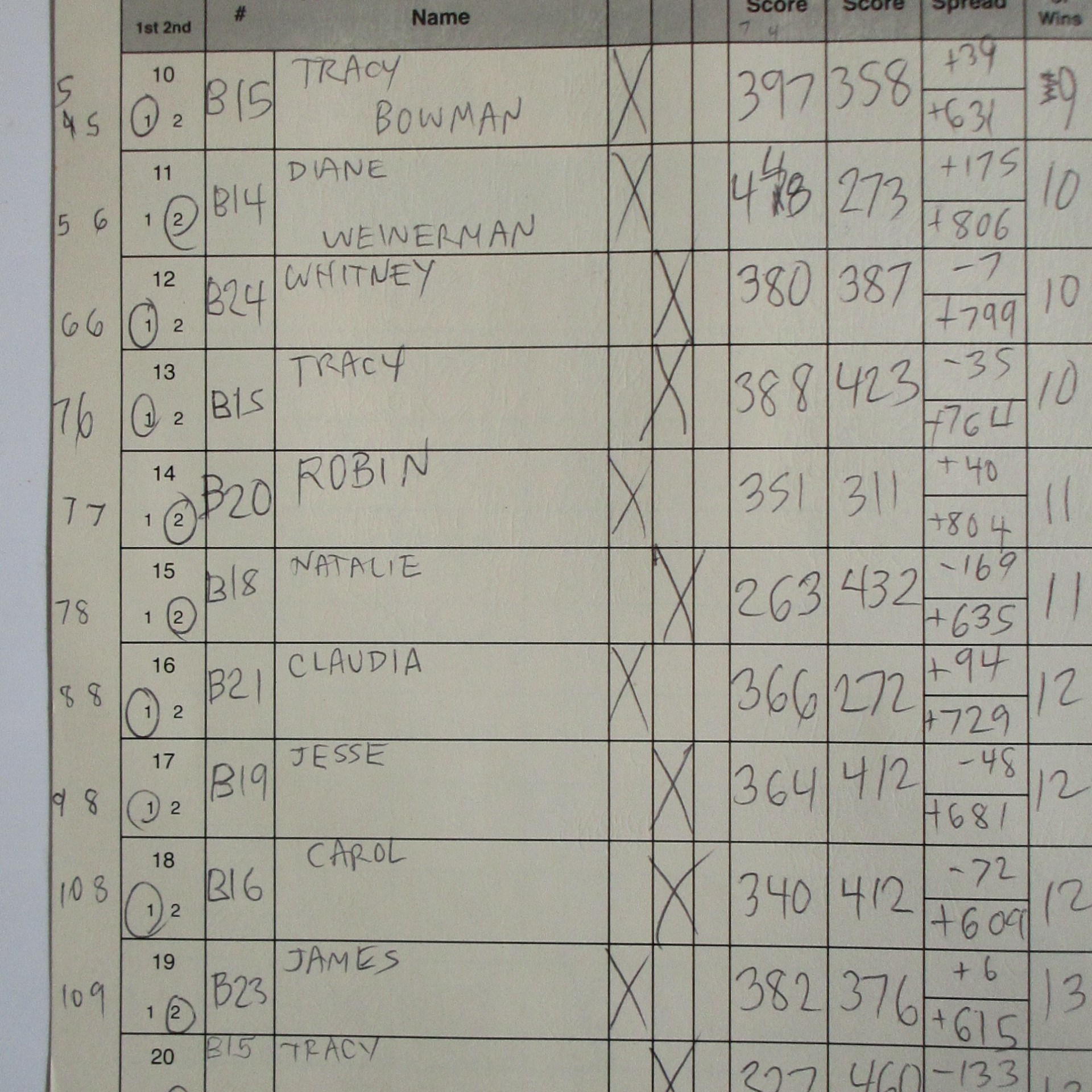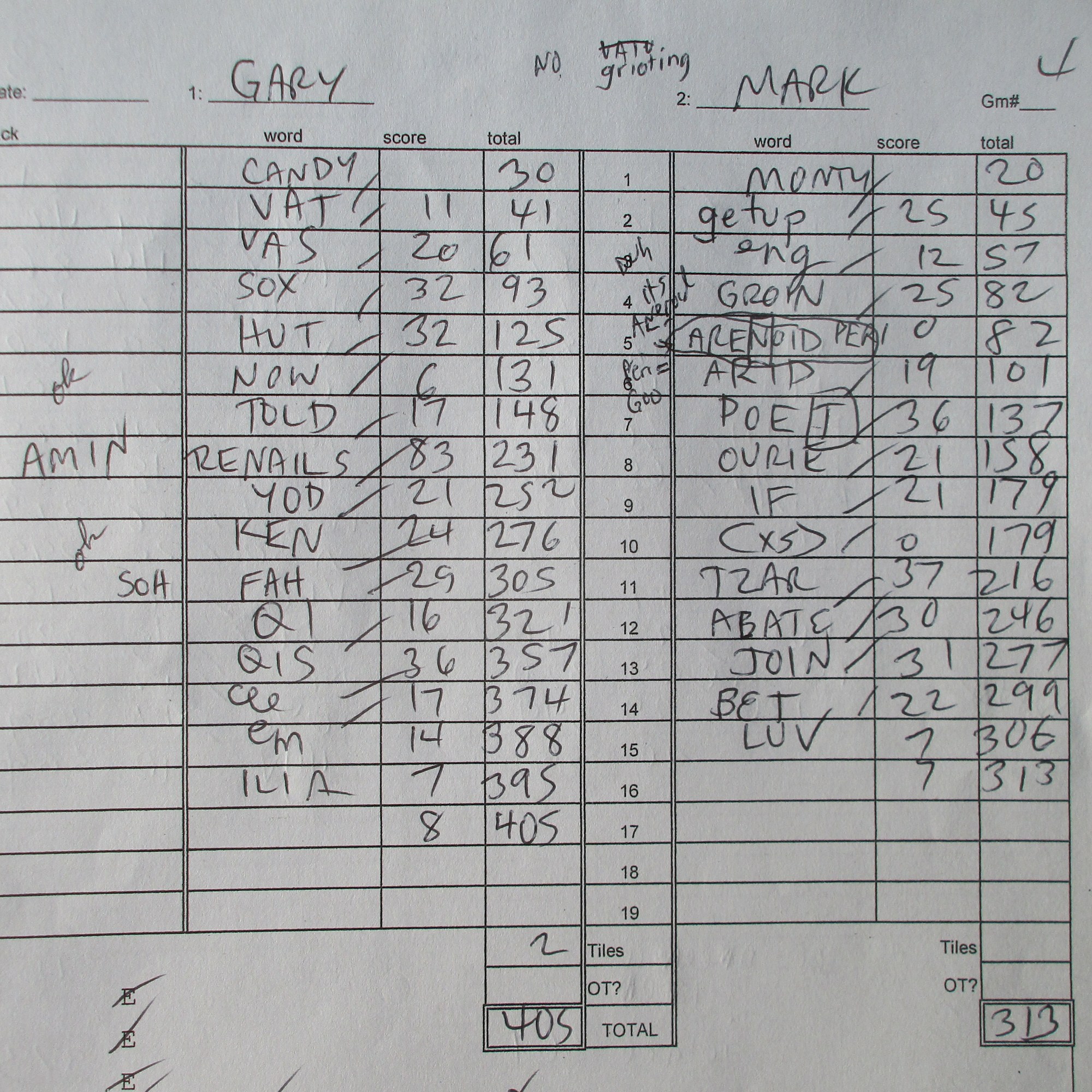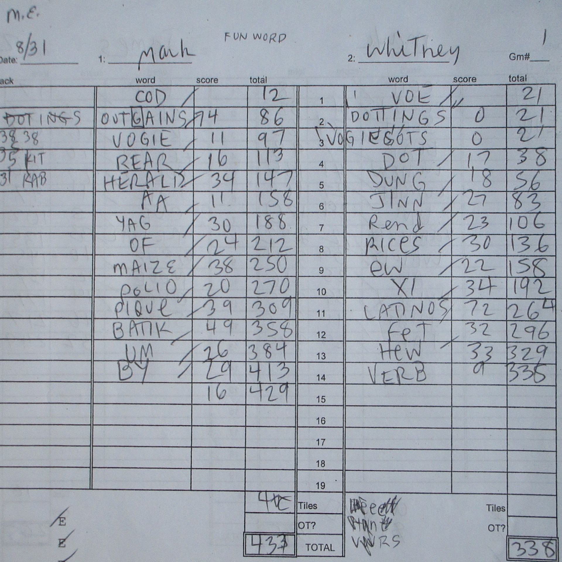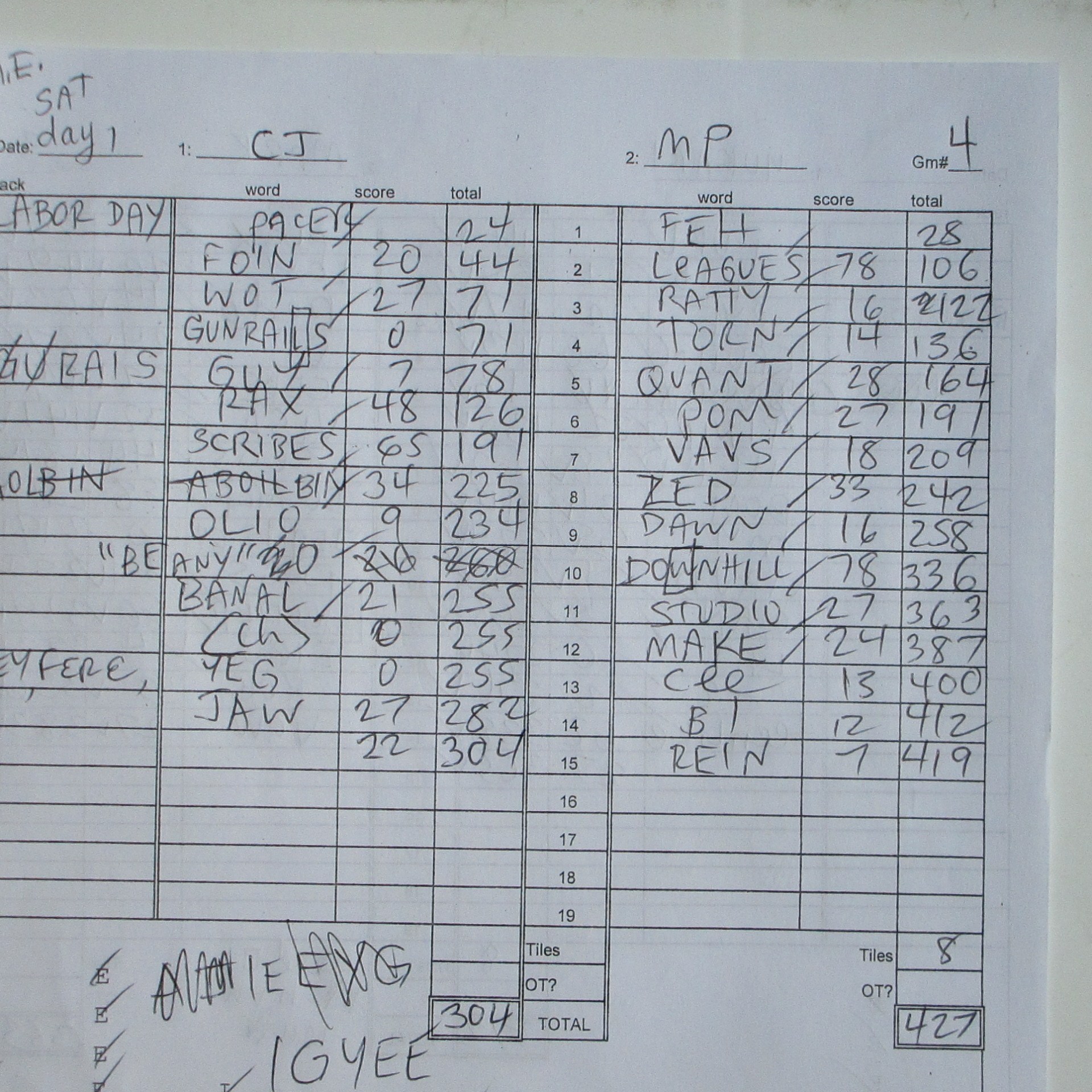 I’m 13-7, 2nd place to Tracy’s 14-6. My envelope in the pic reads Div 2 2nd place $310. Cash inside 15 x $20’s + one $10 (probably already in my wallet at this point). Results at this website: http://wordgameplayers.org/ratings/index.php?c=pu&a=tr&tournamentID=637&ratingType=Standard I averaged 385 pts per game in Early Bird too opp’s 407. I averaged 383 ppg in Main event to opp’s 359 combined. I didn’t do bingo counts nor other stats for this tourney. Final scoresheet front & back: