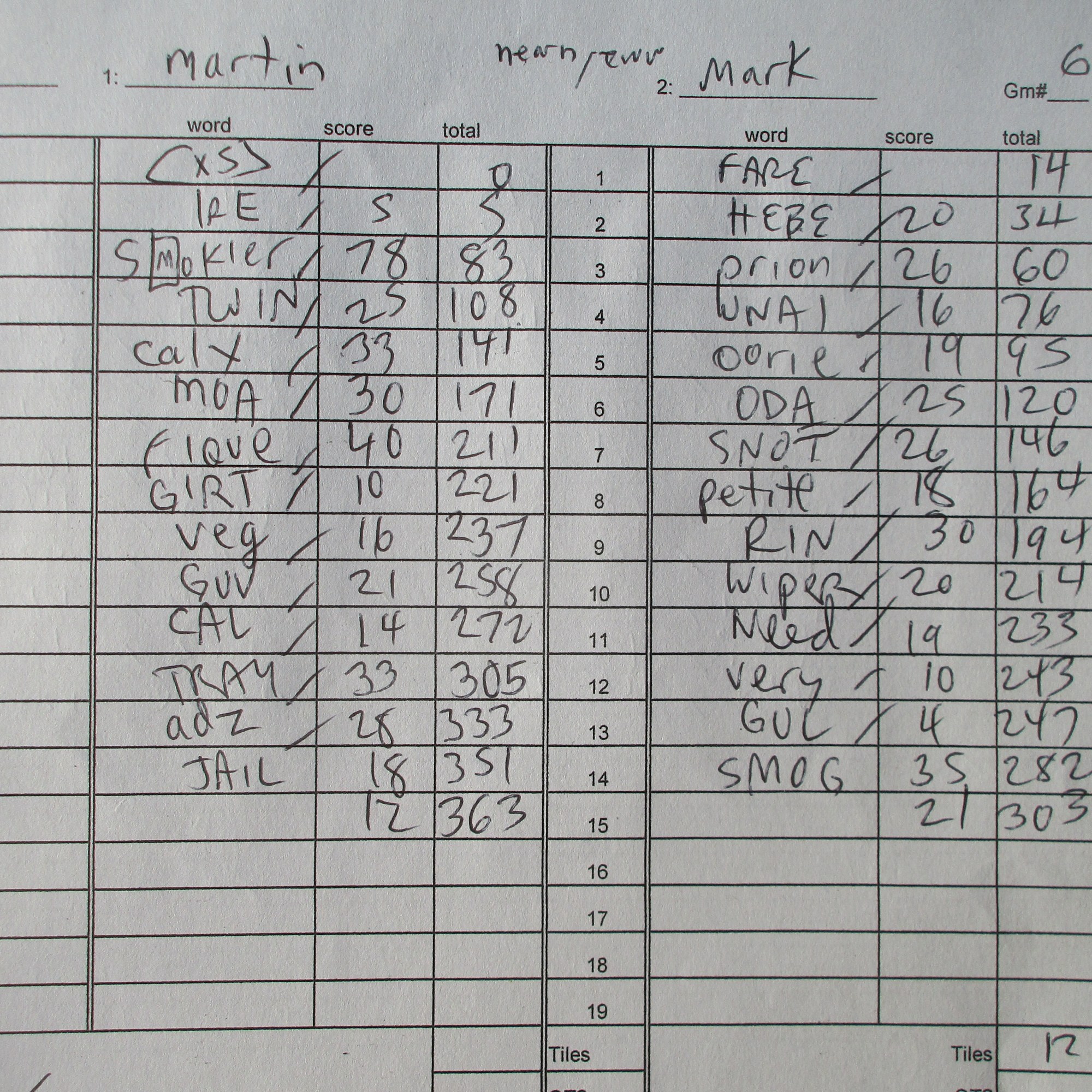 Game 1 notes: I wrote TORT but played TROT. <x2> means player exchanged 2 tiles for zero score. My OUTcALLS was brave – it’s Good but I wasn’t sure. I tried “PEARY” (the quotes means it’s a phony) and opp challenged it off. Opp challenged my MES and lost her turn because it’s Good. I tried “NOSER” = no good for 0 pts. Missing words on scoresheet were VID 23 and CUE 13 for me, JOIN 11 and ICK 9 for opp. Lucky to win this first Game. Scoresheets are of my own design – column 2 is always for player going first.