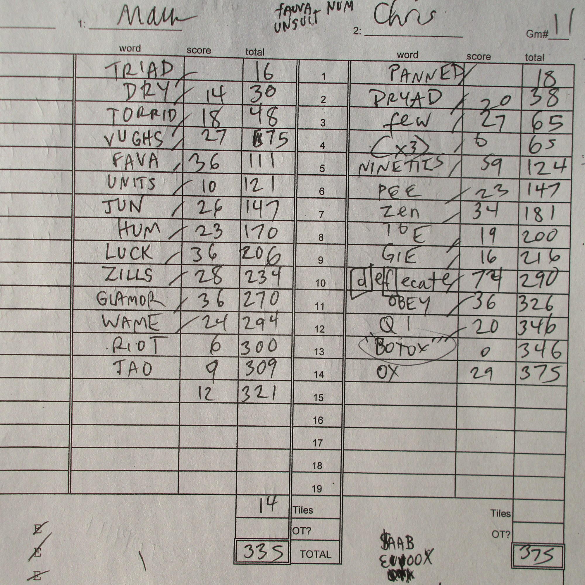 Game 11: Opp Chris lived in Seattle so we’re good friends. His two bingos to my no bingos made it difficult to keep up. He got greedy near the end with “BOtOX” thru the T of RIOT and I knew it was phony. My outplay of SI 12 made it ‘only’ a 40-pt LOSS.