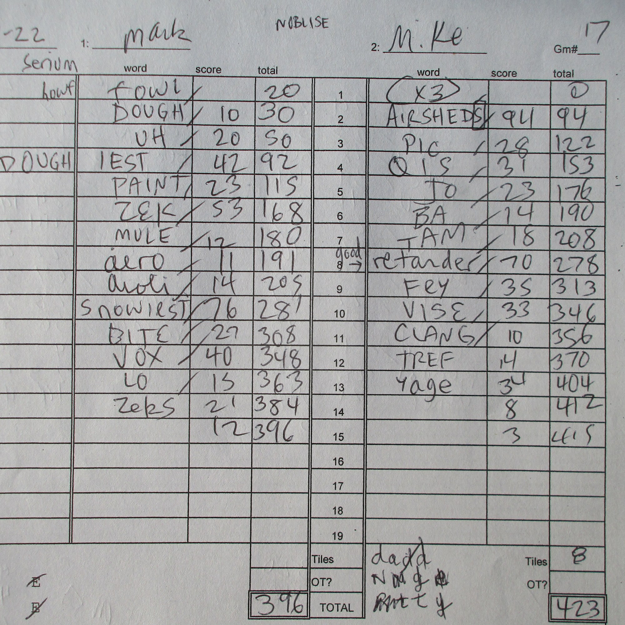 Game 17: Opp’s DBL DBL word score AIRShED(S) 94 was sweet on play 2 and RETARDEr 70 bold bingo later were key plays. I gamely gave it my all with doughIEST 42 extension, ZEK 53, bingo SNOWiEST 76 and VOX 40, but came up short. LOSS