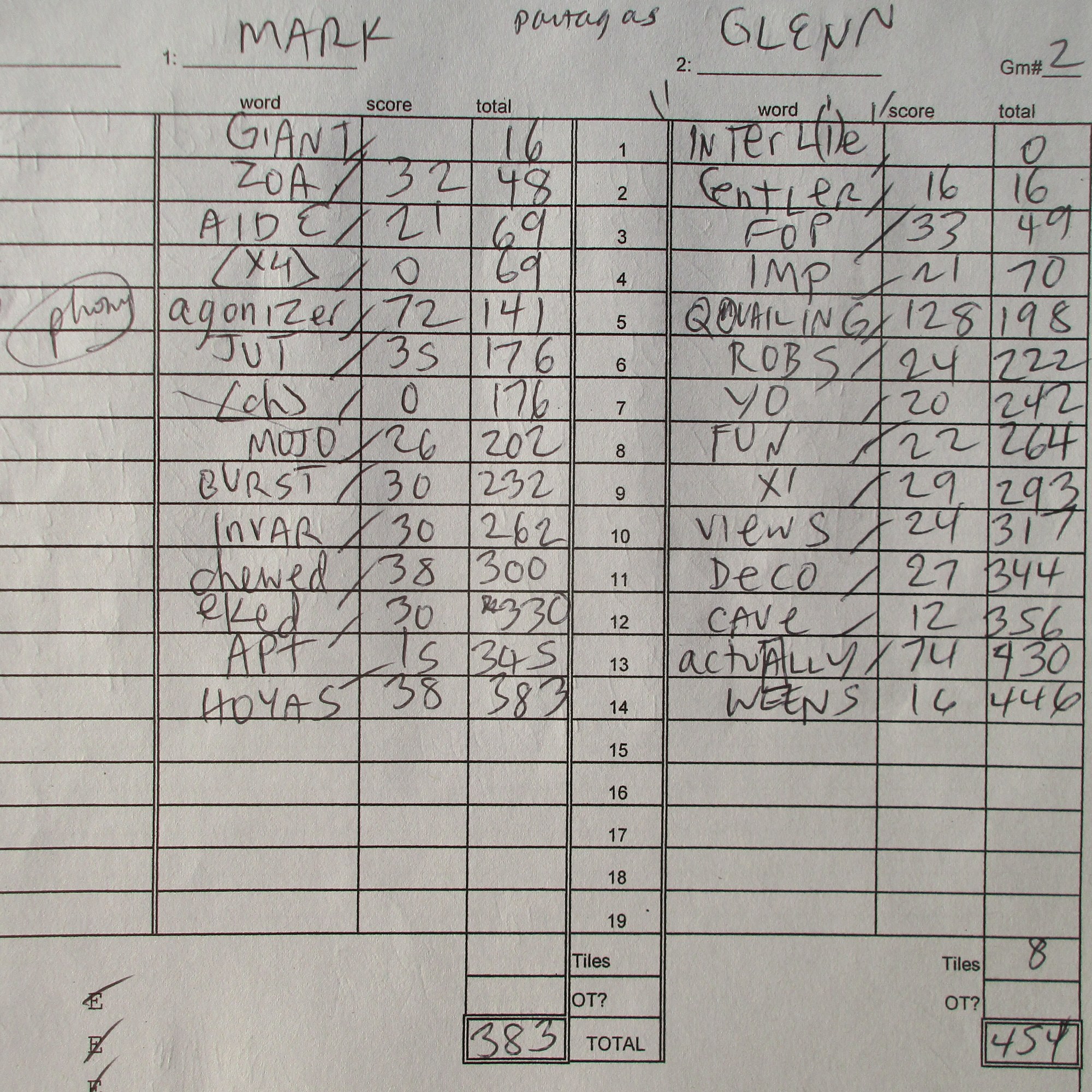 Game 21: Glenn likes to mess with his opps, always asking “Do you agree?” when verifying the total score. He’s not fun to play against, but he doesn’t pull that verbal shit with me, so I don’t mind. This started good when I challenged off his first play “INTERLIE”, which most folks might let stay. He let my phony bingo “AGONIZER” 72 stay on, meaning he didn’t recognize it as phony, probably because he had the HUGE play of QUaILING 128 as a reply. I lost a turn challenging his AIDER, but I got away with adding an S to “AGONIZER” later on. Small conciliation as his ACTU(A)LLy 74 put it away. Tough LOSS. End of a poor Day 3, I went 2W-5L for a record of 11-10 overall.