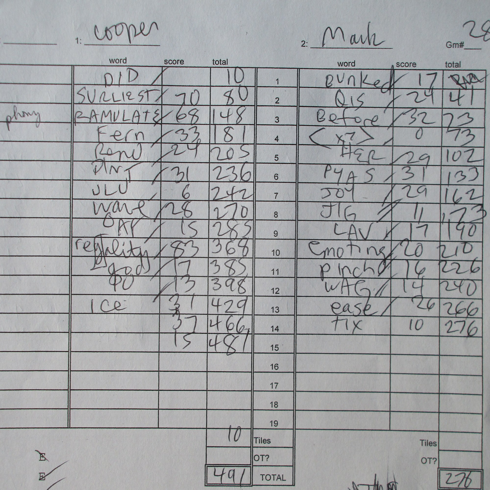 Game 28: I gave too much credit to my young opponent, letting “RAMULATe” 68 bingo stay on. Proved too late he’s capable of phonying. I had no bingos and really no chance in this blowout LOSS. End of day 4, going 4W-3L today, 15-13 overall.