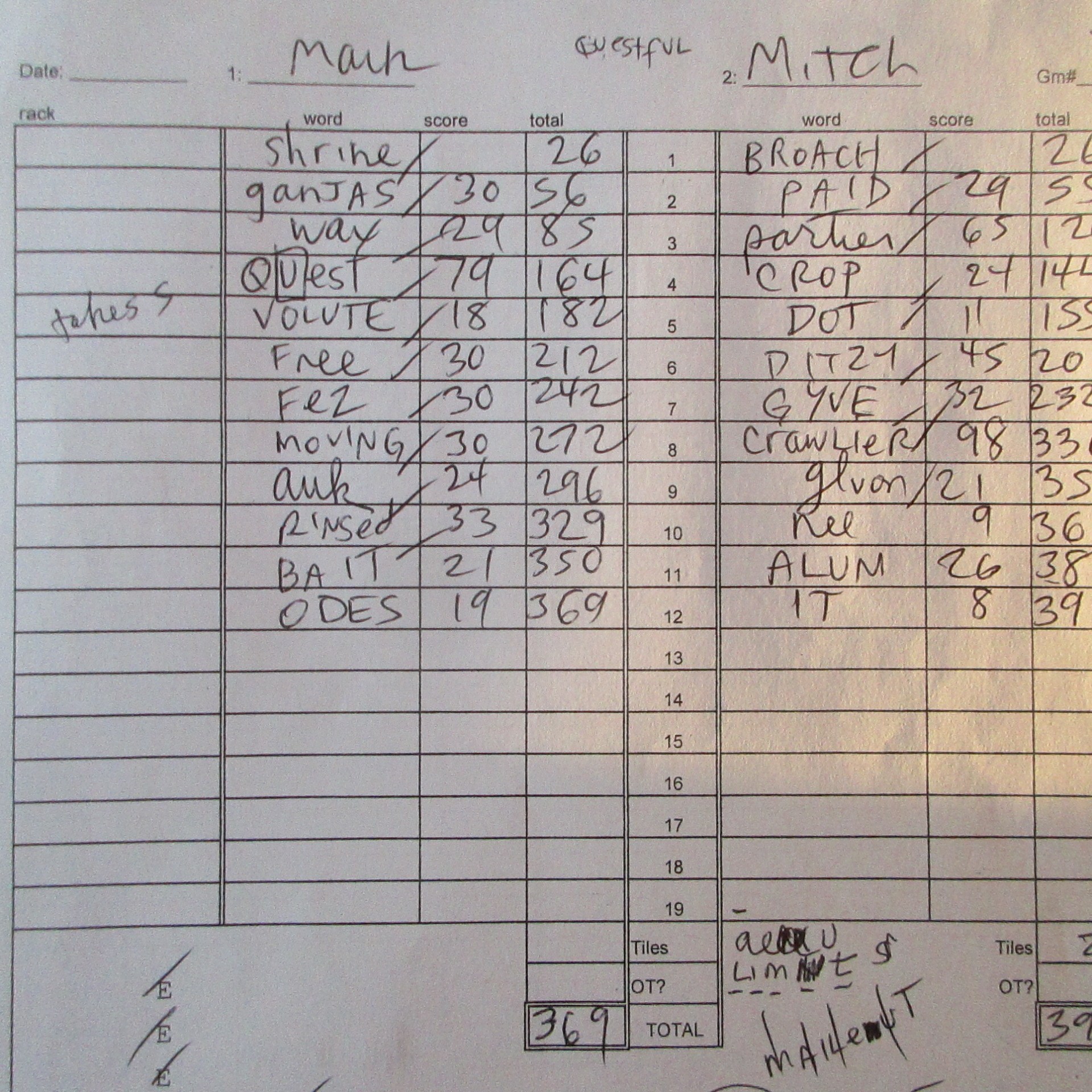 Game 20: Ugh, another one I just…couldn’t…quite…keep up. Opp got the only bingo of the game and stuck me with the Q when he went out. LOSS.