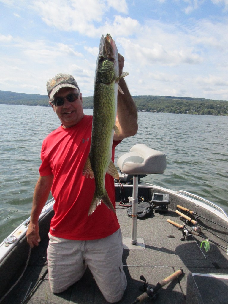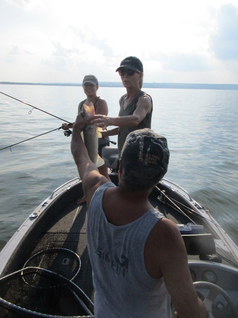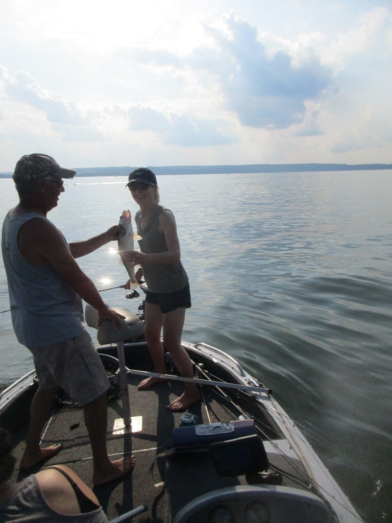 Friday we tidied up the cabin, packed out our stuff and motored the boats to the launch, loaded the boats onto the two trailers, said our adioses and Mike & I drove to Chatauqua Lake about 2 hours away. We stayed at Mike’s cabin/house on a canal adjacent to the lake. Theresa joined on Friday eve, we went out to a brewpub for a fun dinner. Saturday, niece Marissa joined and the four of us went out fishing. We hit a couple of Mike’s favorite spots, one was the spot he’d caught a huge MUSKIE earlier in the summer. The next spot, I latched onto a nice walleye, which we put in the boat’s livewell. We anchored there and ended up putting TEN walleyes in the livewell. Walleye tend to school, unlike bass. They are Mike’s favorite fish as they taste the best: “The filet mignon of the fish world.” “The tug is the drug.” is another fishing cliche I learned first-hand. Mike fileted them all, battered and deep-fried them and we enjoyed another great fish fry Saturday eve. Mike & I went out at 8AM fishing at the same spot and boated 8 more walleye, 15″-to-20″, in 2 1/2 hours. These also got fileted on shore and put in the freezer. After watching the Bills football game, we packed up and headed home. Mike dropped me off at mums house and he gifted her three filets, battered & deep-fried. I got a day & 1/2 of scrabble with mum and she dropped me at the airport Tuesday afternoon and I made it home about 11PM. Couldn’t ask for better weather in NY and I had a great time assuaging my fishing jones.