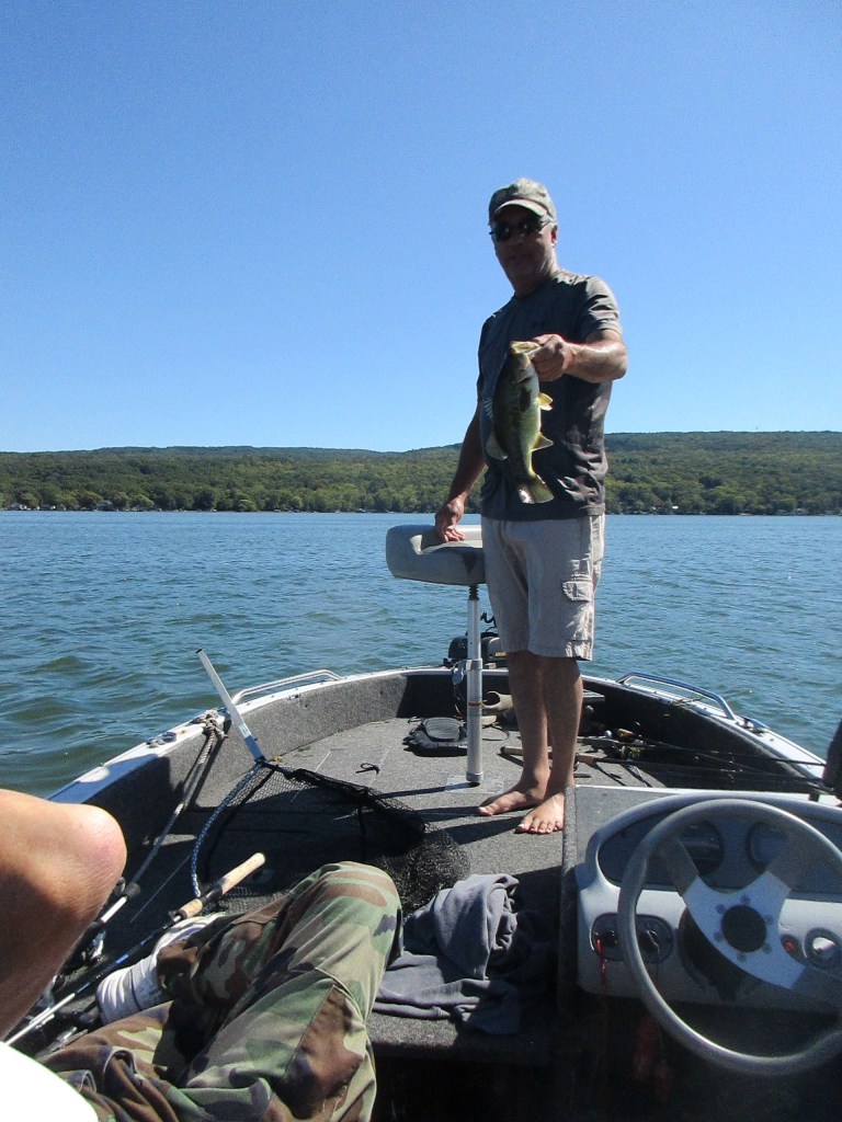 So, when my cousin Jim told me he’d booked a cabin on Honeoye Lake for a week in mid-September, and brother Mike signed on to join & bring his bass boat, I booked my trip. I brought along my best reel and some spinnerbait lures. Mike picked me up at our mum’s house and we arrived at the Honeoye boat launch on Friday. We fished for a couple hours and caught a few largemouths. I motored the boat to the cabin’s dock and Mike drove his truck around the lake to the cabin. Uncle Tom & cousin Dan arrived later. Jim was flying in from Tucson but was delayed until Saturday due to weather in Chicago.