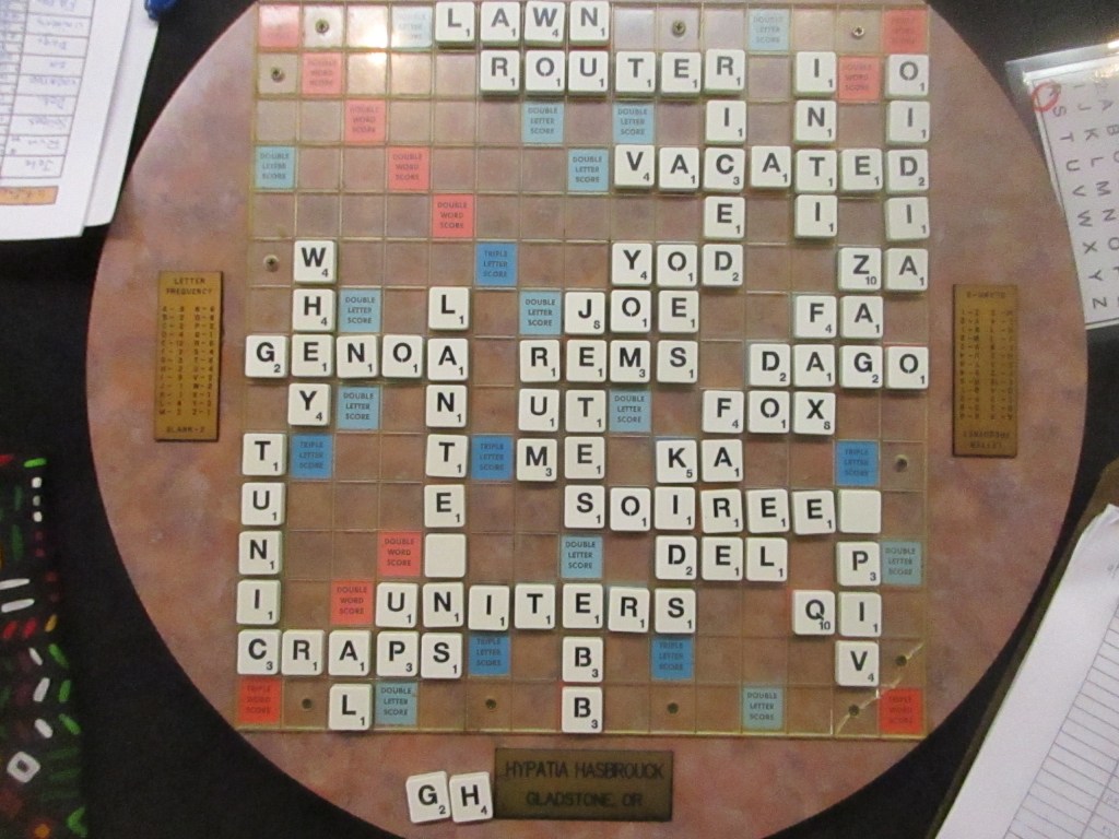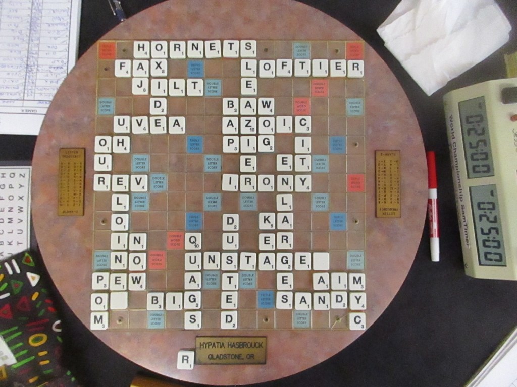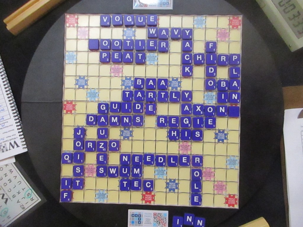 Main Event Saturday, Game 1 – my second play was a chancy oUT(G)AINS which went unchallenged and it’s good. Opp tried a bingo answer “DOtTINGS” which I sent off via challenge. My next play was a trap: VOGIE 11, which opp fell into by adding an S to the end, which I know is not good. Hence, a trap. I kept up with strong plays, so her late bingo LATINOS wasn’t enough. WIN. I am ranked #1 in this Div 2. I had told the director I would like to play “up” in Div 1, but he put me in Div 2 the night before to keep the divisions with an even number of players.