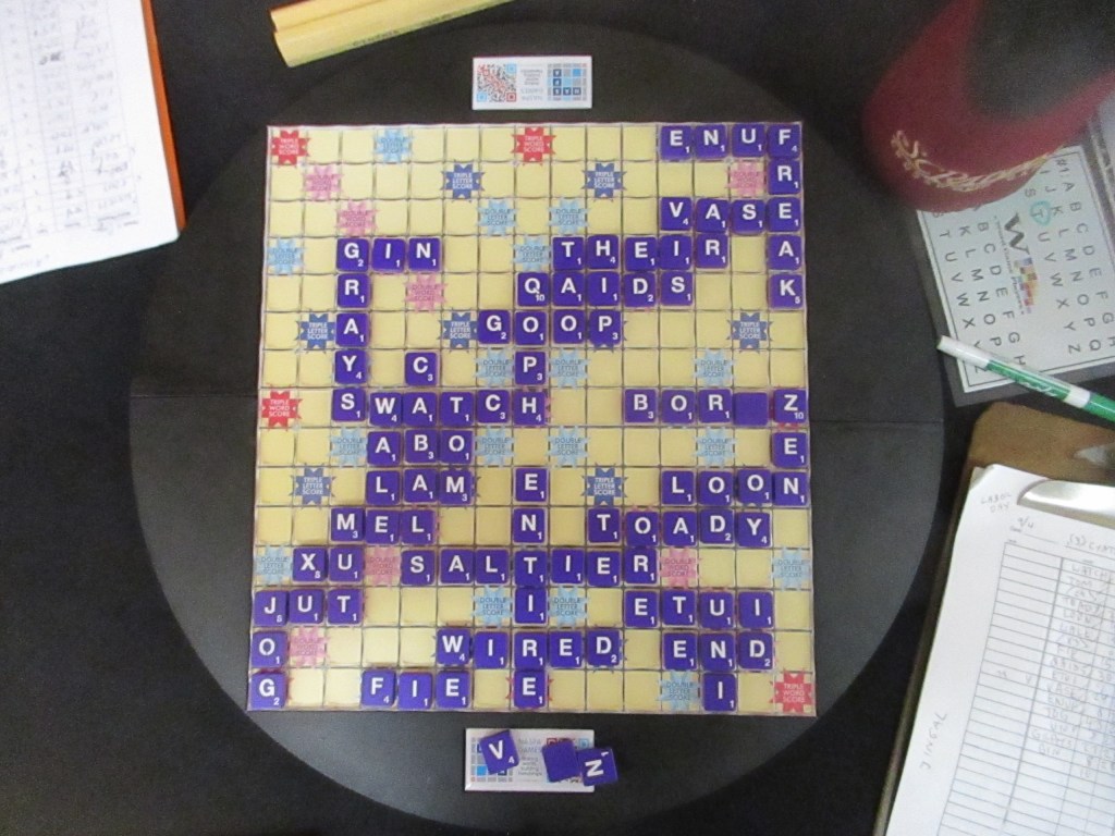 Game 14: A high-scoring ‘shoot-out’ where I got up 78 pts after 5 plays each – I played strong while opp “played off” tiles – jO 10 and Bo 4 – to set up his imminent bingo(s). Play 6 we each played phony bingos which we both allowed to stay on: me: “TEENIES”, he: “UNRAISES”. Opp followed up with a beauty (R)AWHIDE 81 but I remained in the lead. My 2nd bingo ENSNARE 68 assured me a nice WIN. End of a heady day 2 where I went 6W-1L for a record of 9-5.