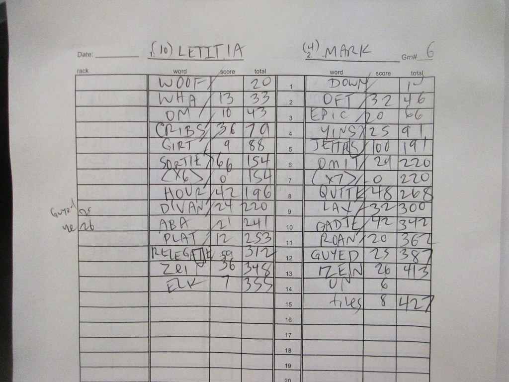 Game 6 – The tiles are sideways on the first three plays as I took the photo after we’d started a recount. It’s a good way to see which tiles were on the board at the time each word is played. She starts with a bingo PRONA(T)E 73 and I answer with a phony that she allows to stay on: “VOMITA” 22. My bingo DENIALS 74 brought it close, and my QUIRE during the endgame gave me a shot. I put the S on joker, but she found an outplay U(M)IAq 14 which gave her a one-point victory due to a one point tile left on my rack. I did a recount and couldn’t find any errors to rescue me. Tough LOSS.