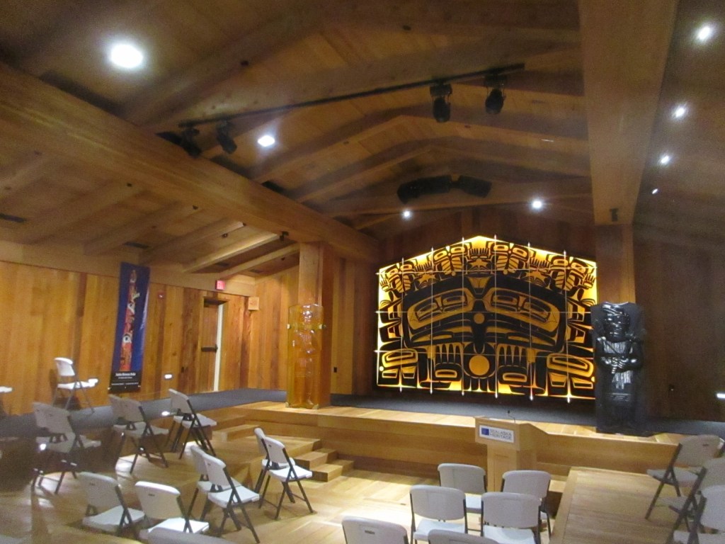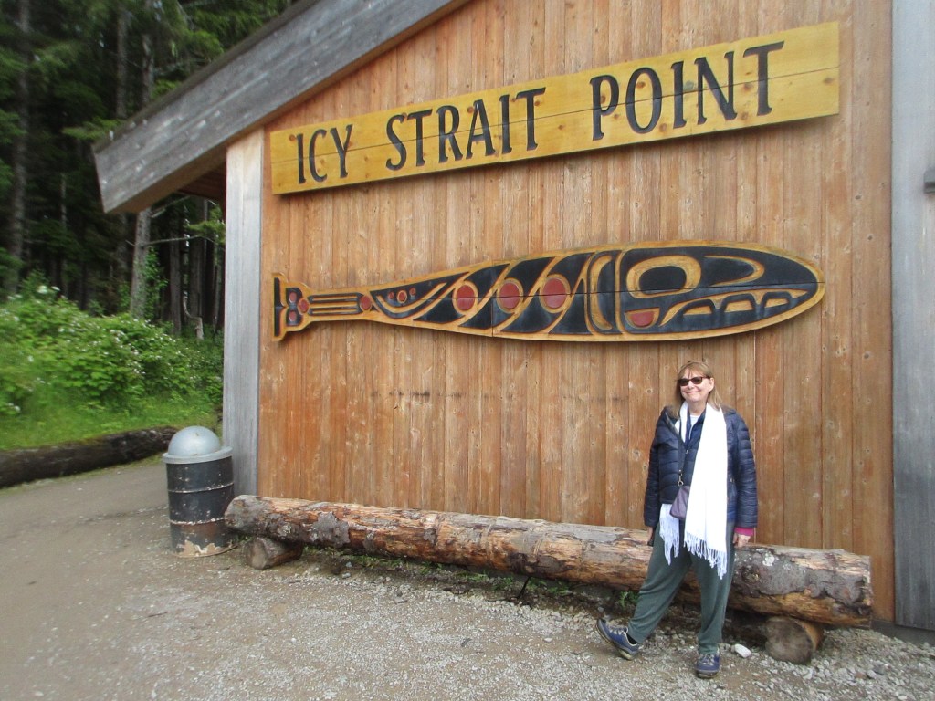Woke up Tuesday morn to a calm sea full of mini-icebergs in Glacier Bay National Park. Then we went to dock at Icy Strait Point and the small village of Hoonah. The Tlingit tribe used to live around Glacier Bay until the Glacier there GREW and pushed them out of their villages in the 1750s. They relocated to Hoonah. The dock is a private dock of the tribe. They must make good money, there are two beautiful trams, a zip line, two restaurants, a couple of tourist shops and wooden walkways along the beach; not bad for a population of 1000. 6000 tourists disembarked from two cruise ships the day we were there.
