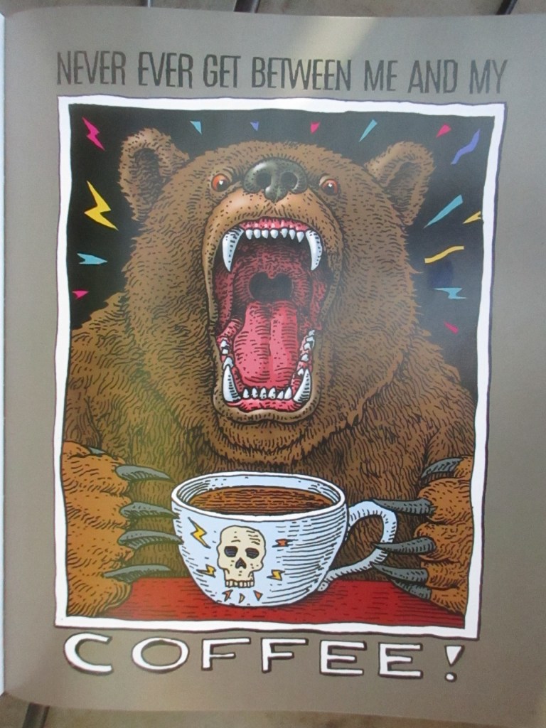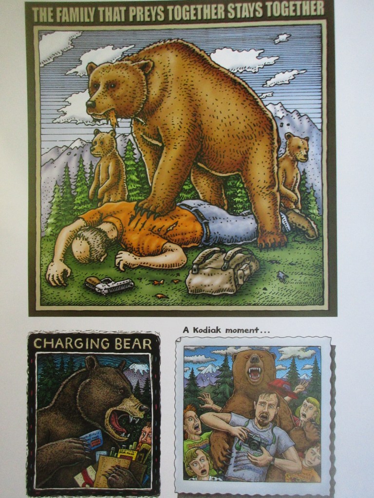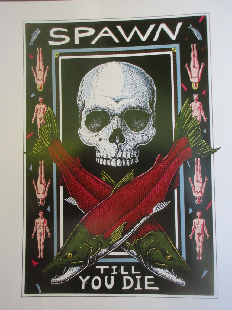 Woke up Thursday in Ketchikan. Pop. 8000, first incorporated (extant) city in Alaska. The dock is VERY CLOSE, right next to downtown. You can start shopping five steps off the dock. Besides some postcards, I hadn’t bought any souvenirs the whole trip, but this $60 coffee table art book- “Spawn Til You Die” – the Fin Art of Ray Troll grabbed and held my interest at a U.S. Park service gift shop in Ketchikan. Ray became “famous” after a T-shirt of the book title poster came out in 1986. His art is very much like Robert Crumb (of Mr. Natural & Fritz the Cat fame). Ray has a great, morbid humor to many of his pieces, and he is so into anatomical accuracy that he has had numerous new species named for him and he’s the artist for many university and government natural science organizations. I also really like Haida artforms and picked out some beauty notecards in Ketchikan.